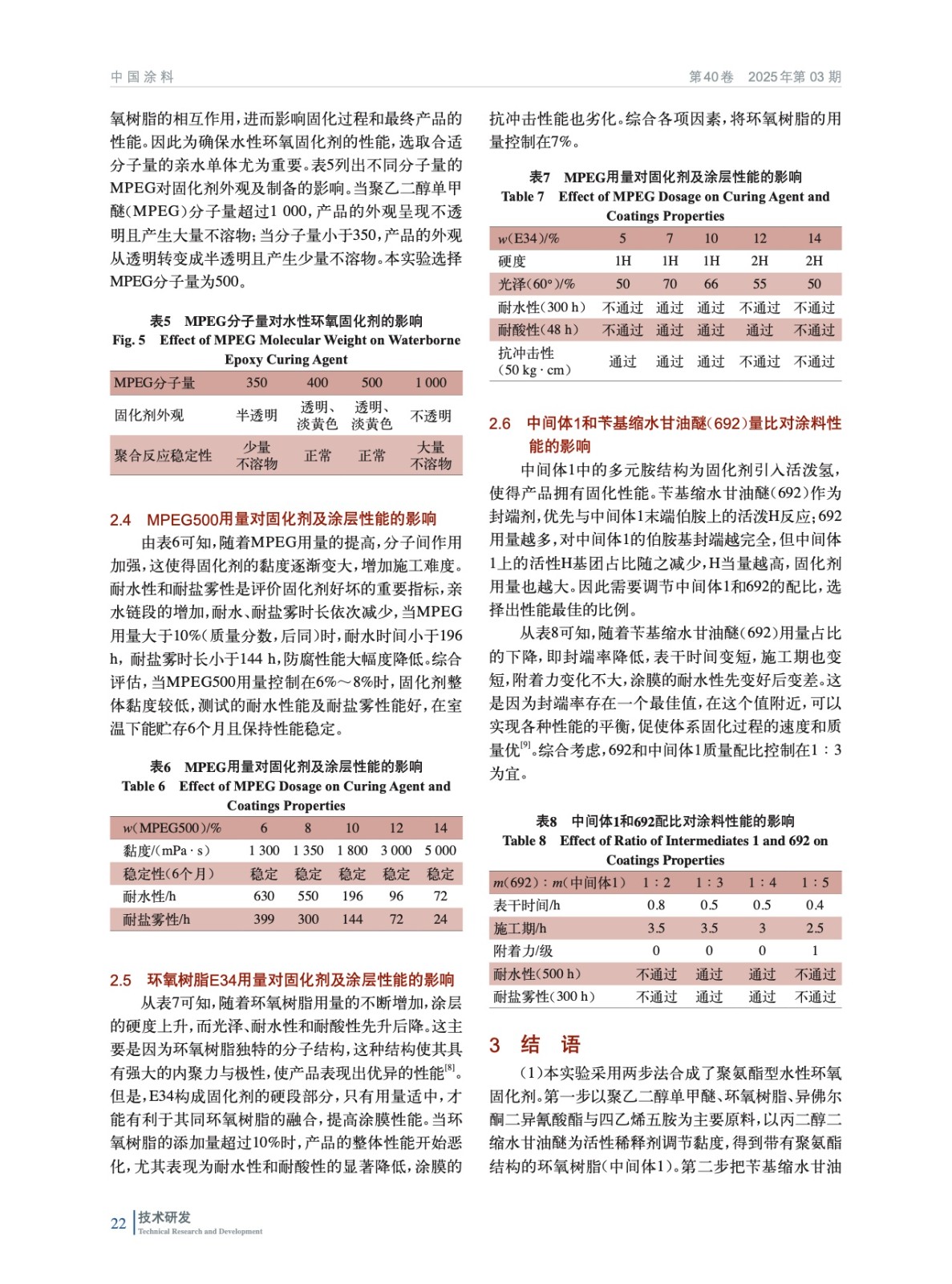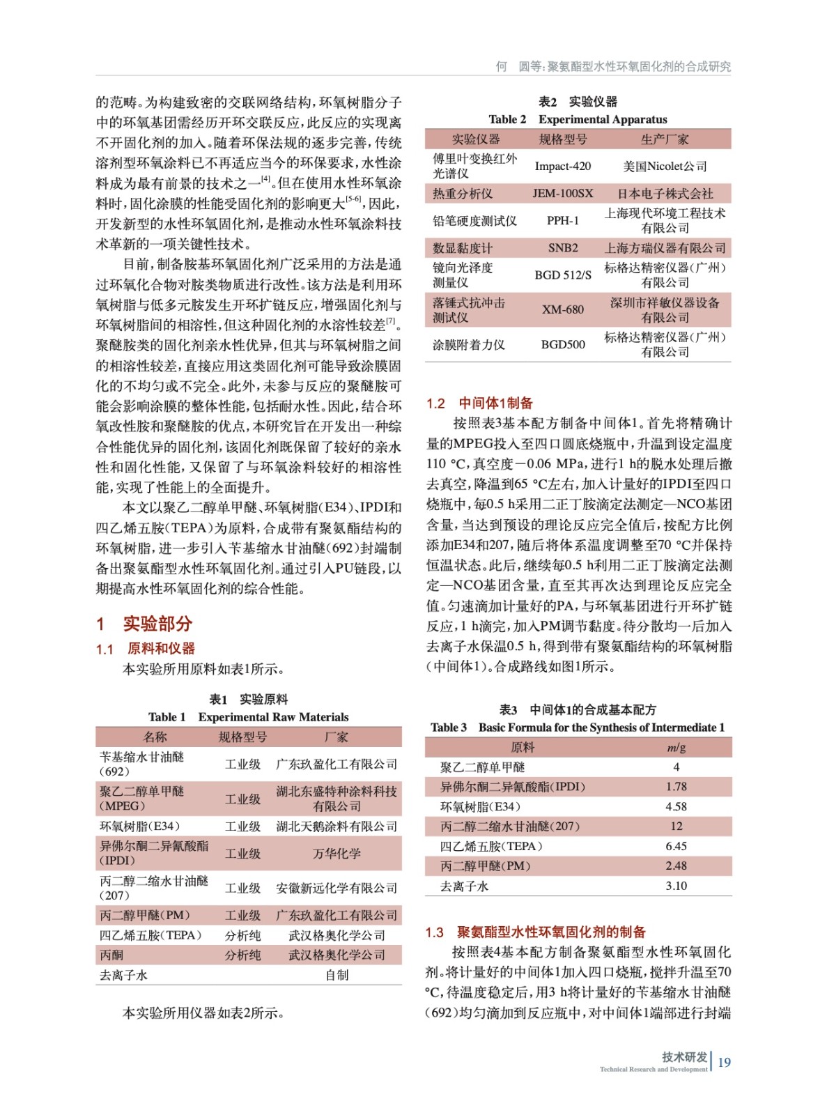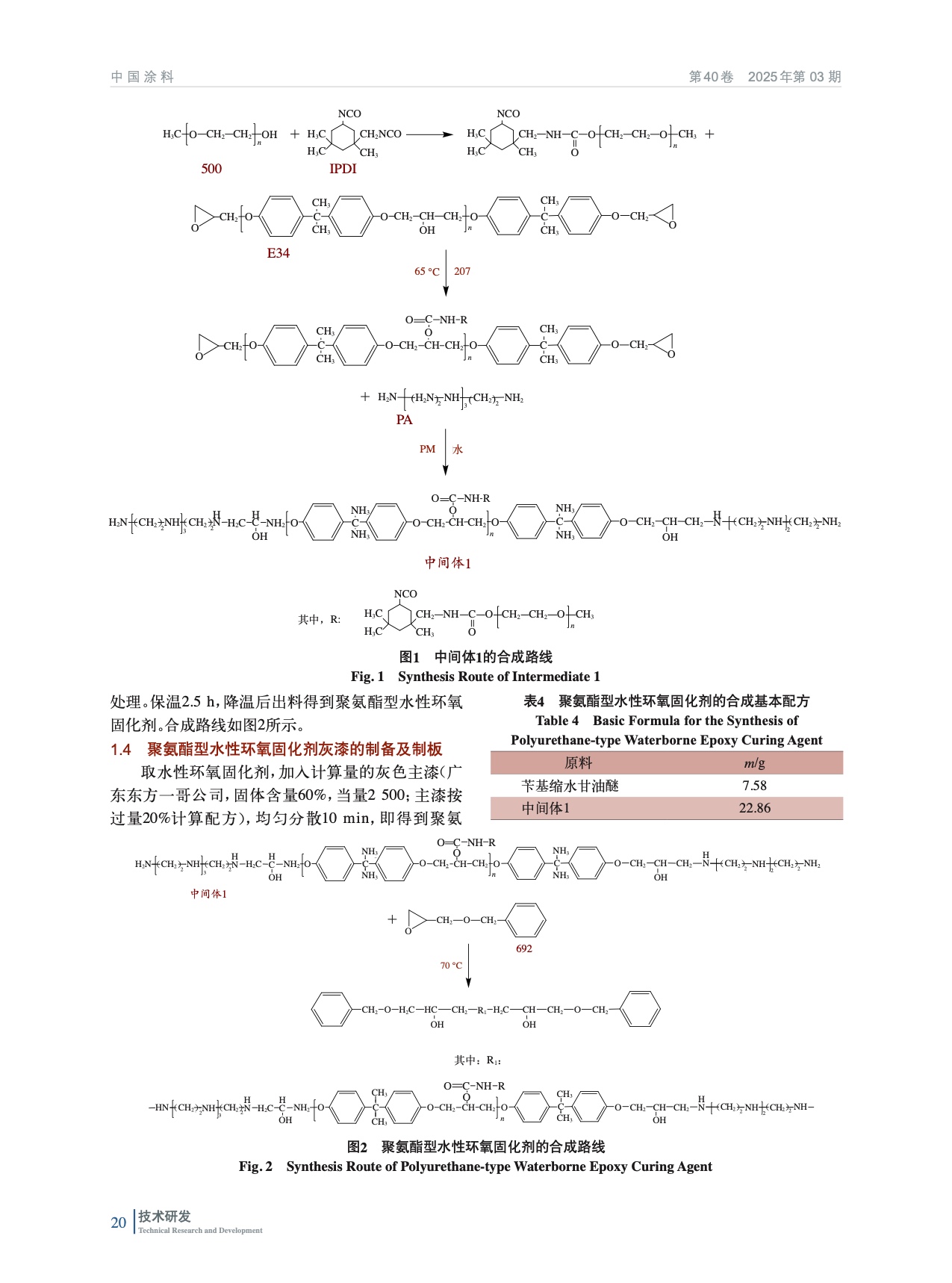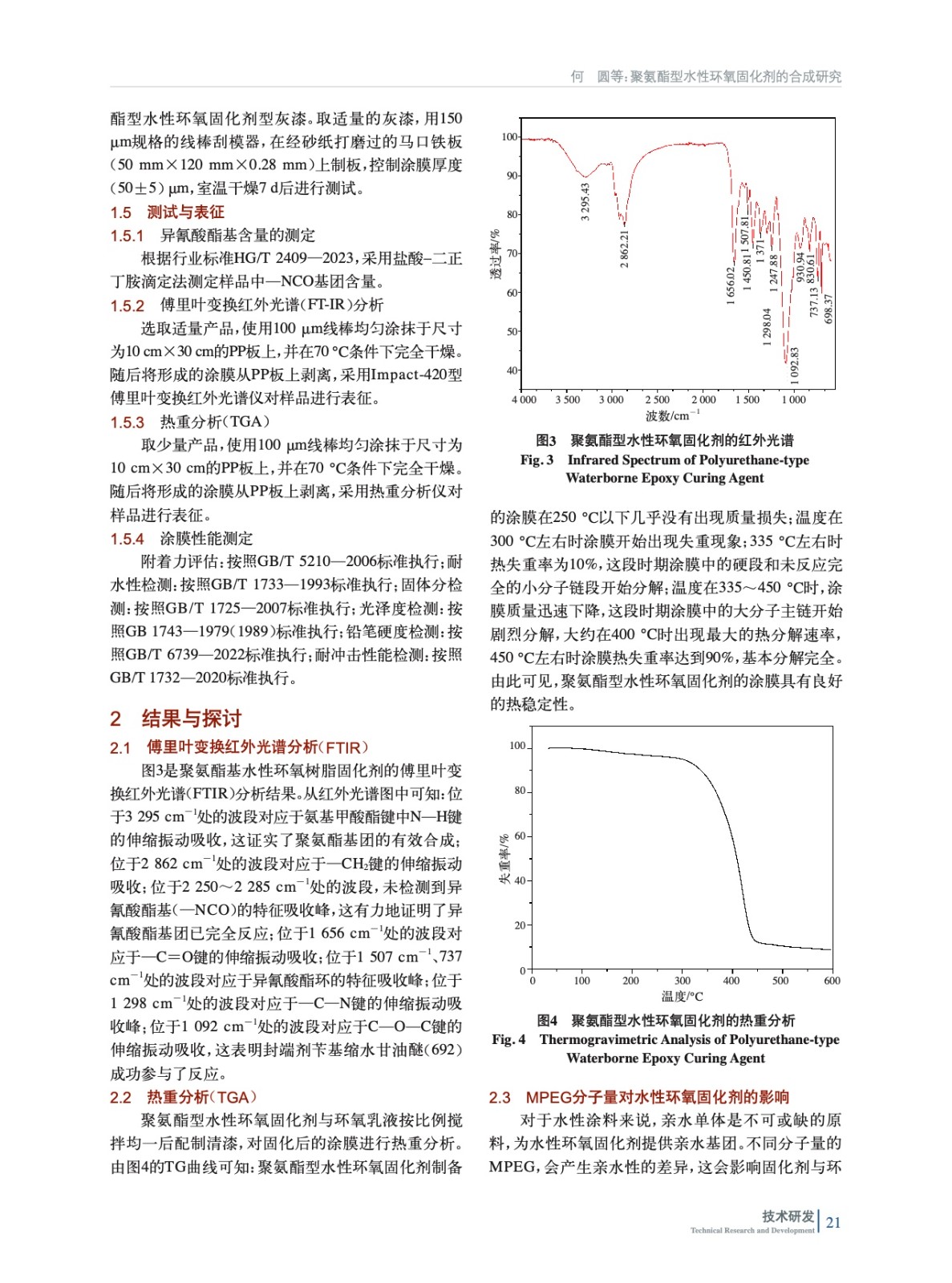 摘要:用聚乙二醇單甲醚(MPEG)、環氧樹脂(E34)與異佛爾酮二異氰酸酯(IPDI)反應,加入活性稀釋劑丙二醇二縮水甘油醚(207)調整體系的黏度,得到帶有聚氨酯結構的環氧樹脂,再加入四乙烯五胺(TEPA)合成得到環氧改性胺(中間體1),選用芐基縮水甘油醚(692)作為封端劑與合成的中間體1反應,成功制備得到聚氨酯型水性環氧固化劑。采用傅里葉變換紅外光譜(FT-IR)、熱重分析(TGA)對產品和涂膜進行測試及表征;同時,考察聚乙二醇單甲醚種類和用量、環氧樹脂用量、692和中間體1配比對固化劑和涂料性能的影響。結果表明:聚乙二醇單甲醚的分子量為500、質量分數6%~8%,環氧樹脂質量分數7%~9%,m(692)∶m(中間體1)為1∶3,合成的固化劑貯存穩定性好,且制備的涂膜也具有較好的耐水性、附著力、硬度等性能。