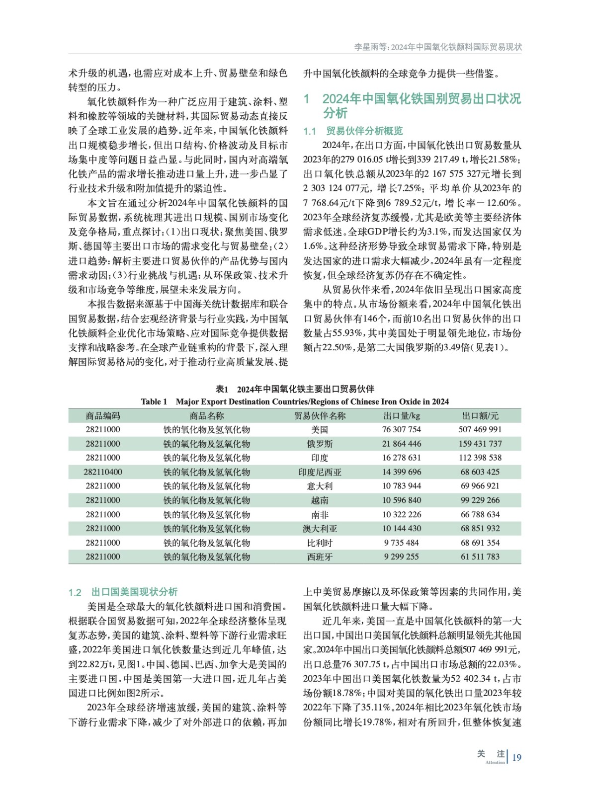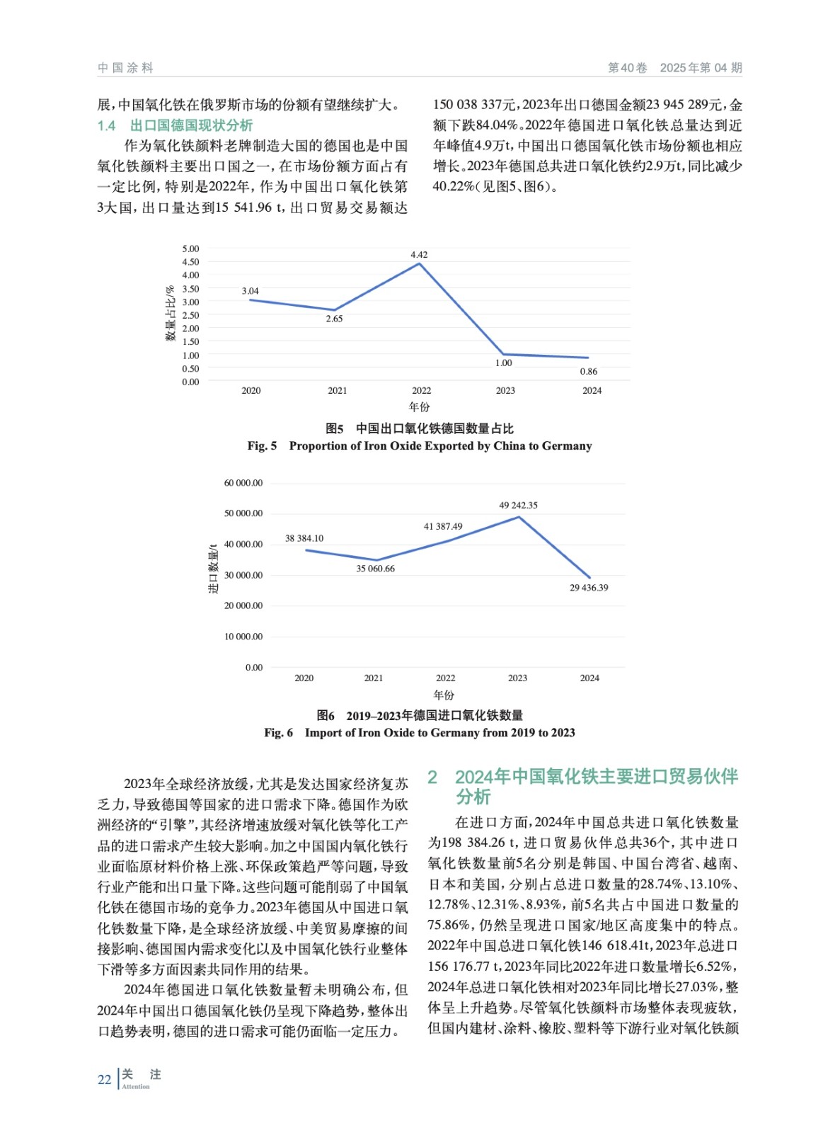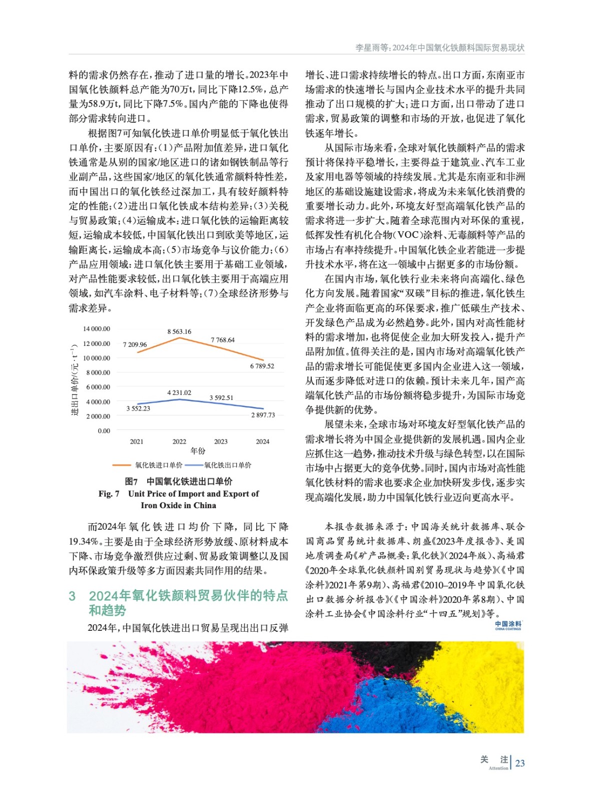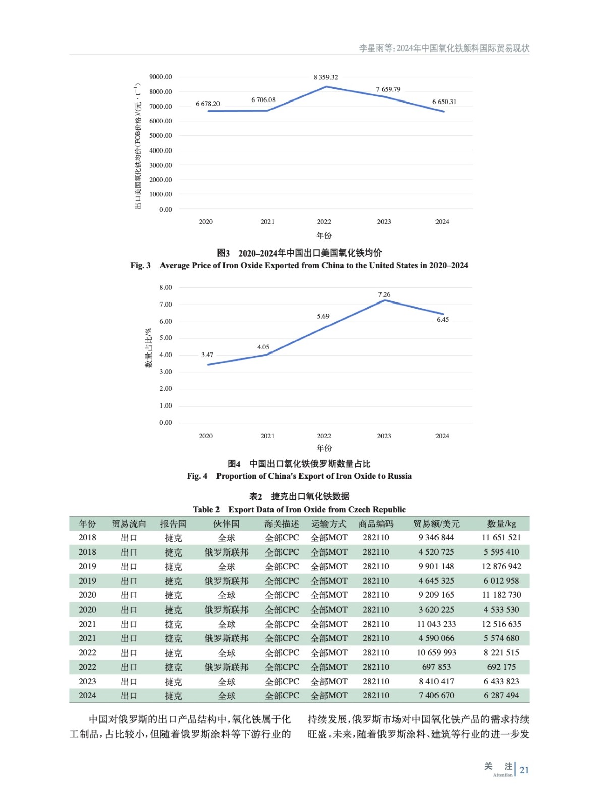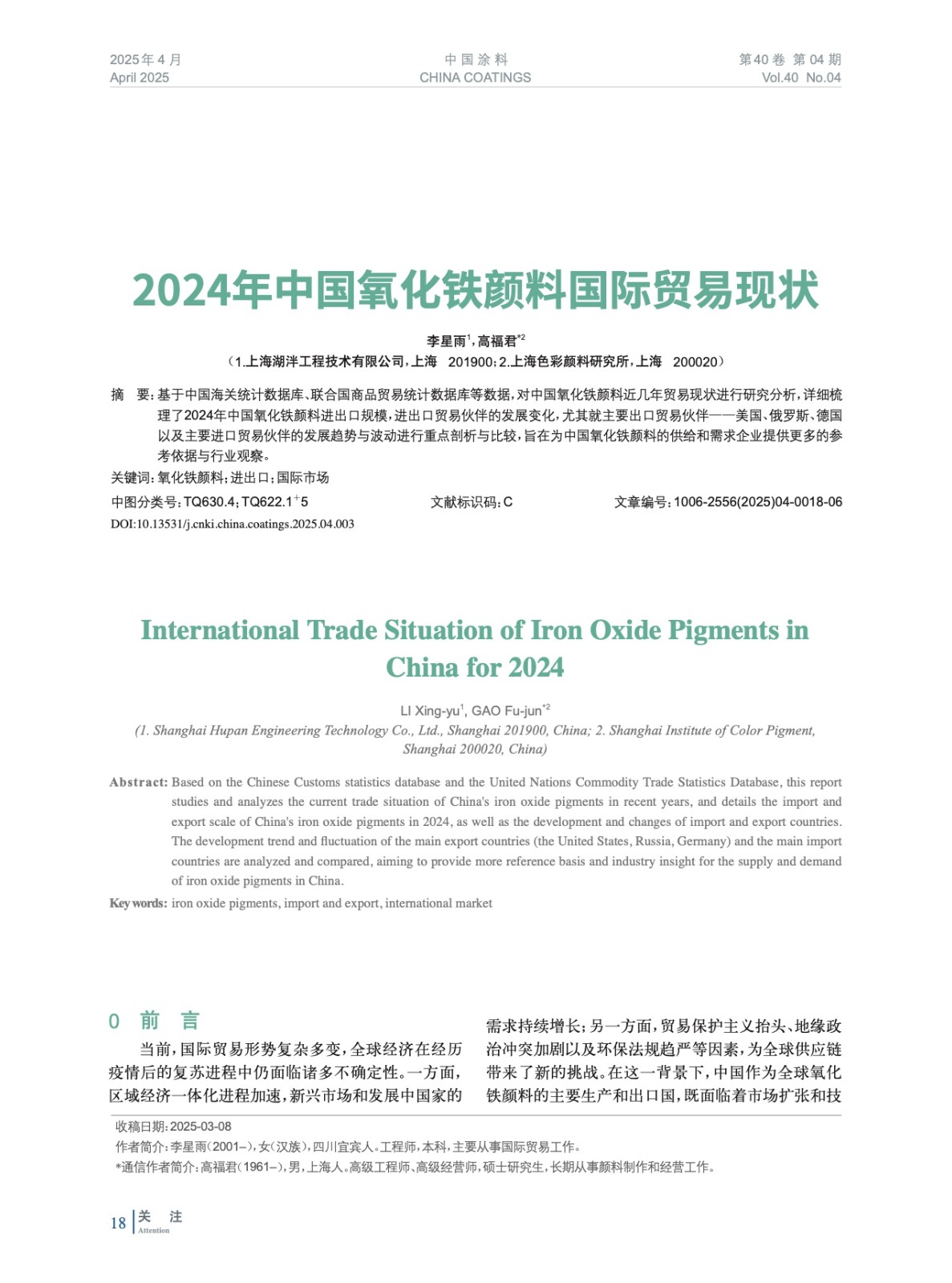 摘要:基于中國海關統計數據庫、聯合國商品貿易統計數據庫等數據,對中國氧化鐵顏料近幾年貿易現狀進行研究分析,詳細梳理了2024年中國氧化鐵顏料進出口規模,進出口貿易伙伴的發展變化,尤其就主要出口貿易伙伴——美國、俄羅斯、德國以及主要進口貿易伙伴的發展趨勢與波動進行重點剖析與比較,旨在為中國氧化鐵顏料的供給和需求企業提供更多的參考依據與行業觀察。