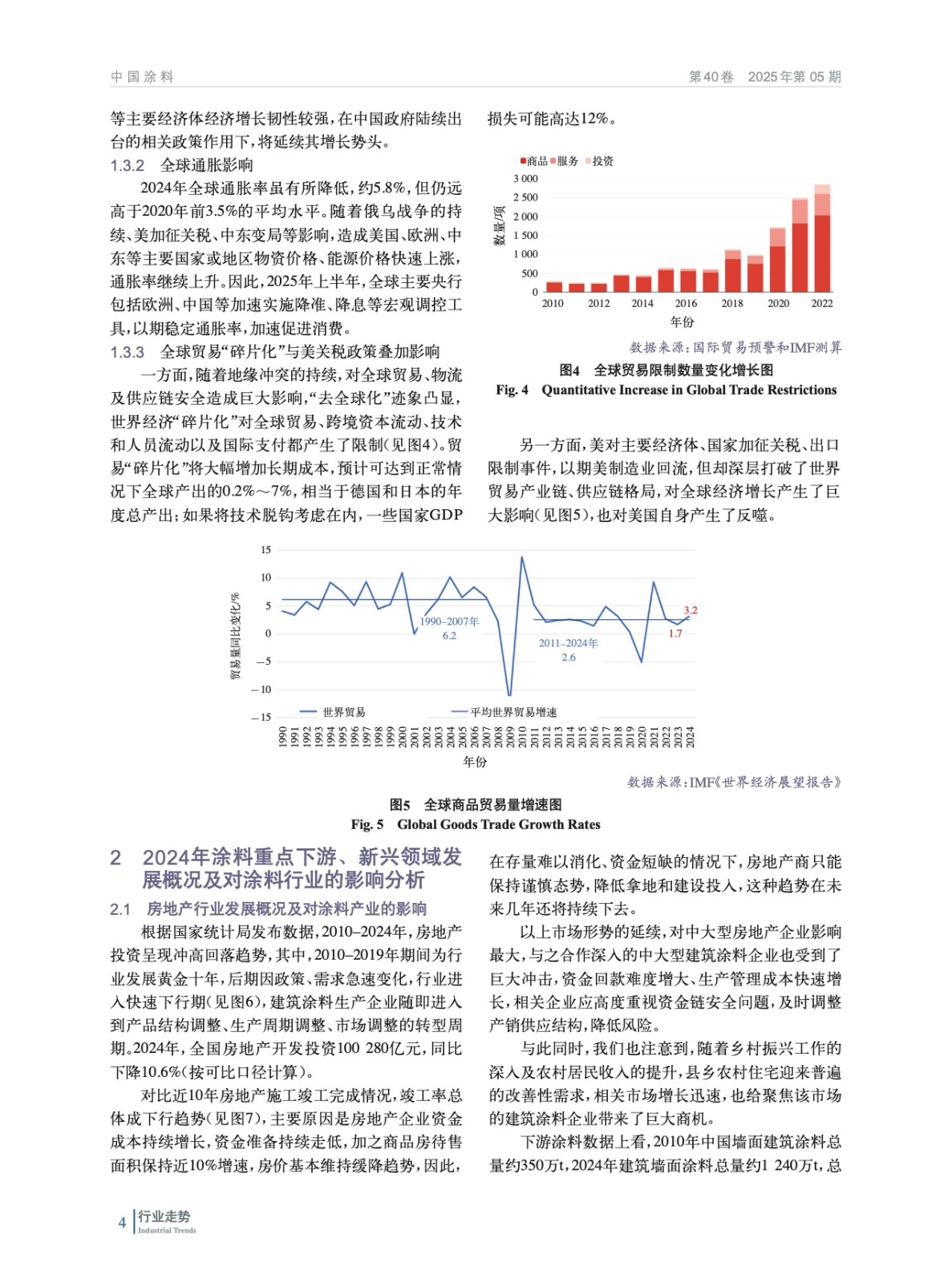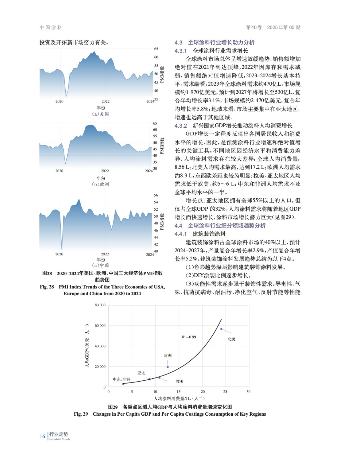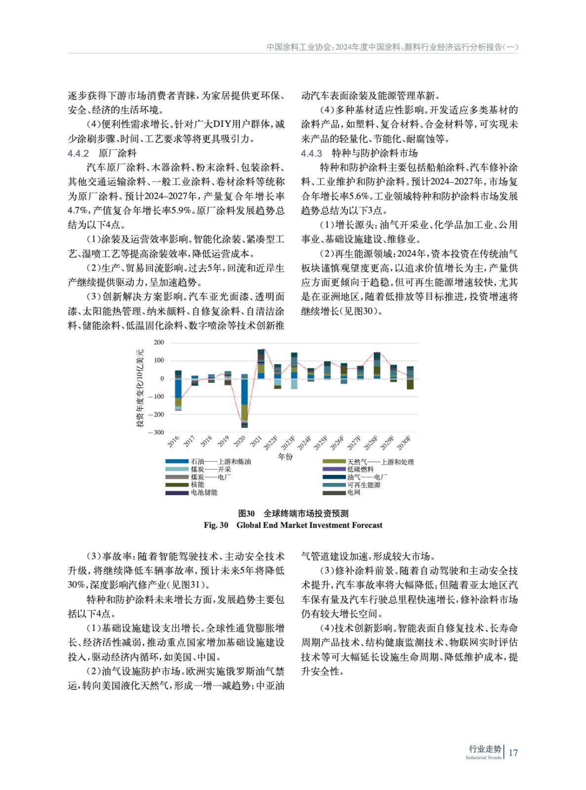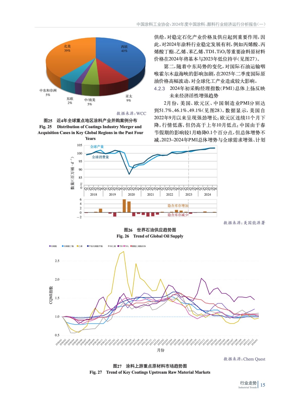摘要:簡析了2024年中國宏觀經(jīng)濟(jì)及外部環(huán)境發(fā)展情況,概括介紹了2024年房地產(chǎn)、機(jī)械、集裝箱、船舶、家具、新能源等涂料重點(diǎn)下游行業(yè)、新興領(lǐng)域發(fā)展概況及對涂料行業(yè)的影響,重點(diǎn)分析了2024年度中國涂料行業(yè)發(fā)展和進(jìn)出口情況。綜述了全球涂料行業(yè)發(fā)展概況,對2024年全球涂料行業(yè)發(fā)展影響因素、全球涂料行業(yè)增長動(dòng)力、全球涂料行業(yè)細(xì)分領(lǐng)域趨勢進(jìn)行了分析。最后對涂料上游鈦白粉、氧化鐵、丙烯酸乳液和環(huán)氧樹脂等重點(diǎn)原材料領(lǐng)域發(fā)展情況進(jìn)行了概述,并對中國涂料行業(yè)特征和發(fā)展趨勢進(jìn)行了分析和預(yù)測。