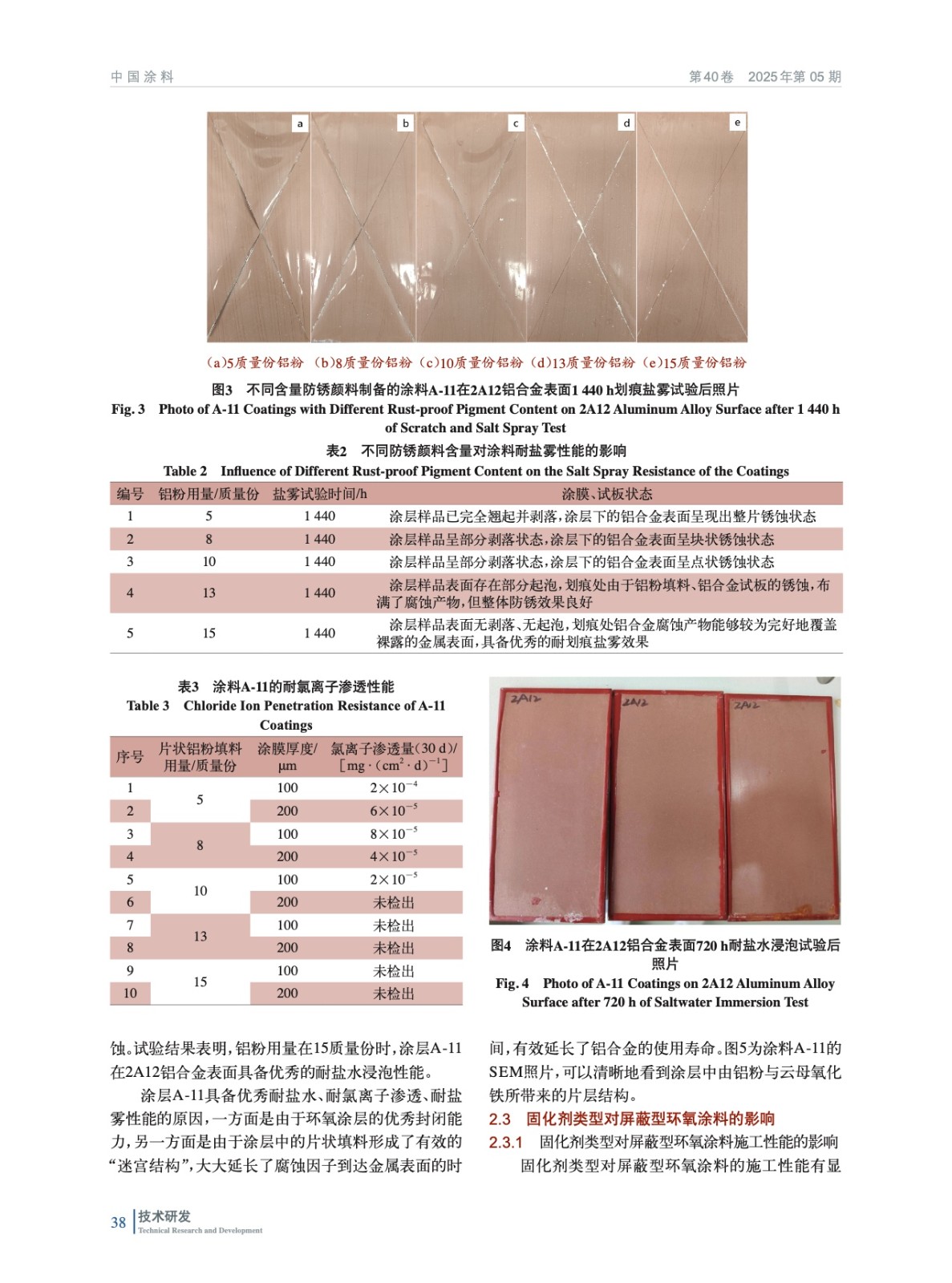 摘要:研發了一種適用于鋁合金表面的屏蔽型防腐蝕涂層A-11,通過調節其屏蔽填料用量、固化劑種類對其在2A12鋁合金表面的耐鹽霧性、氯離子屏蔽性能展開研究,并對其物理性能進行了表征,包括黏結強度、韌性、耐沖擊性能等。結果表明,當鋁粉含量為15質量份,環氧涂層A-11對2A12鋁合金具備良好的耐鹽霧、耐鹽水、防銹蝕能力,在1 440 h的中性鹽霧試驗過程中,做到無起泡、無銹蝕、無脫落;在720 h的鹽水浸泡試驗中無起泡、無銹蝕、無脫落。另外環氧涂層A-11在2A12鋁合金表面具備良好的黏結強度,達到了12.74 MPa;具備較為良好的韌性與耐沖擊性能。同時,研發的涂層A-11具備良好的施工性能,未來在鋁制船舶、設備、海工裝備等的腐蝕防護中具有積極作用。
