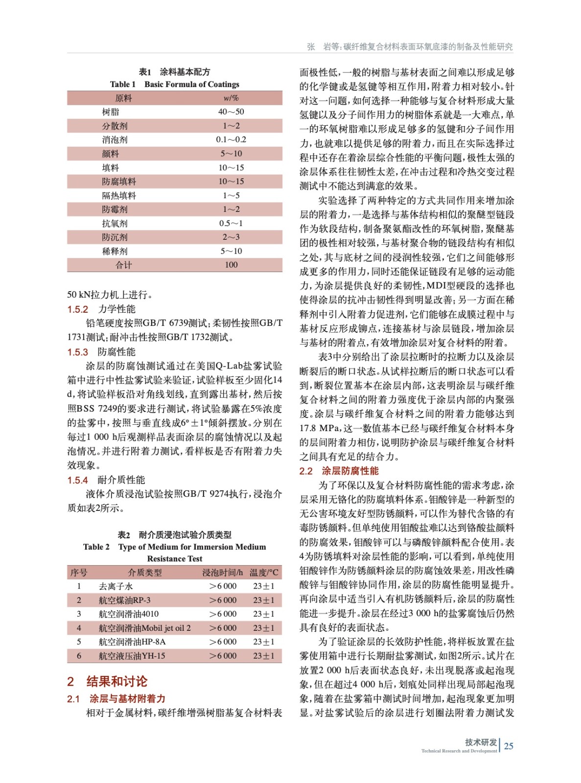 摘要:制備出一種用于碳纖維復(fù)合材料表面的環(huán)氧底漆,并對(duì)涂層與復(fù)合材料之間的結(jié)合力進(jìn)行了研究,分析了涂層的耐介質(zhì)、防腐蝕等性能,結(jié)果表明環(huán)氧底漆與復(fù)合材料之間具有良好的結(jié)合力,涂層具有優(yōu)良的綜合性能,對(duì)碳纖維復(fù)合材料有優(yōu)秀的防護(hù)作用。