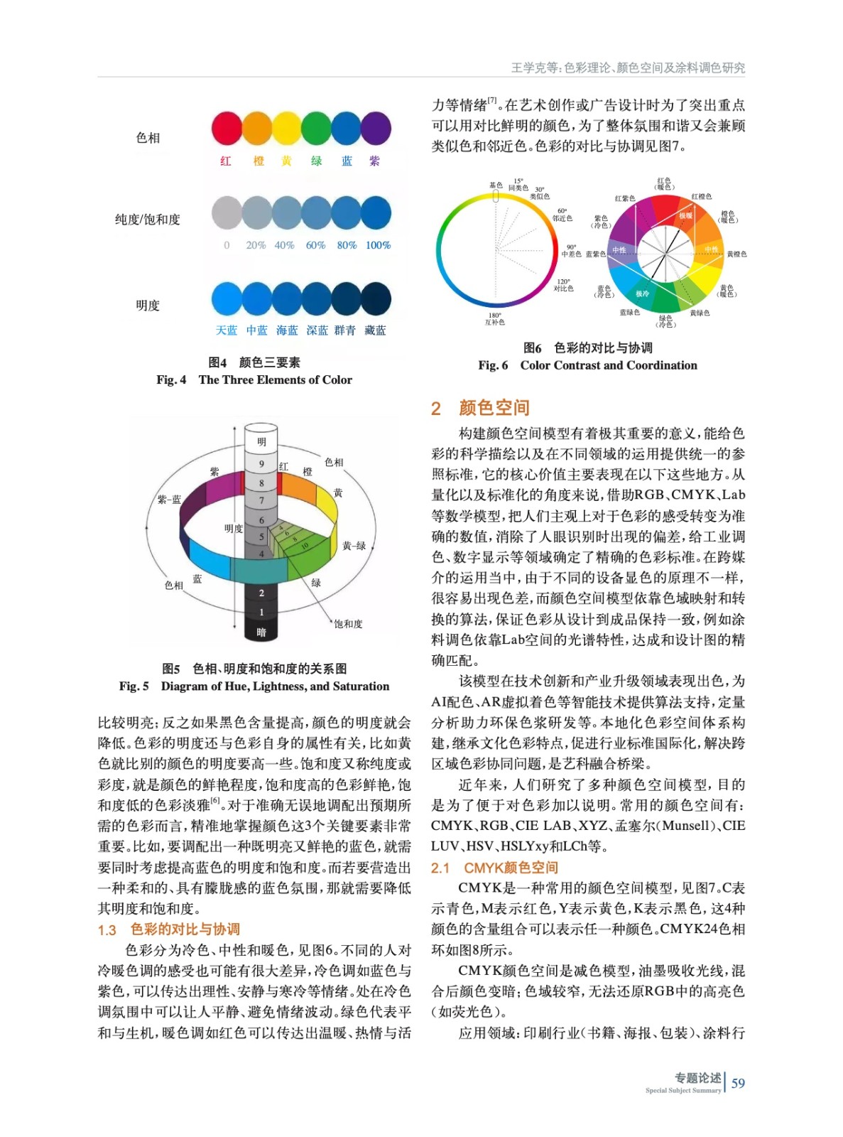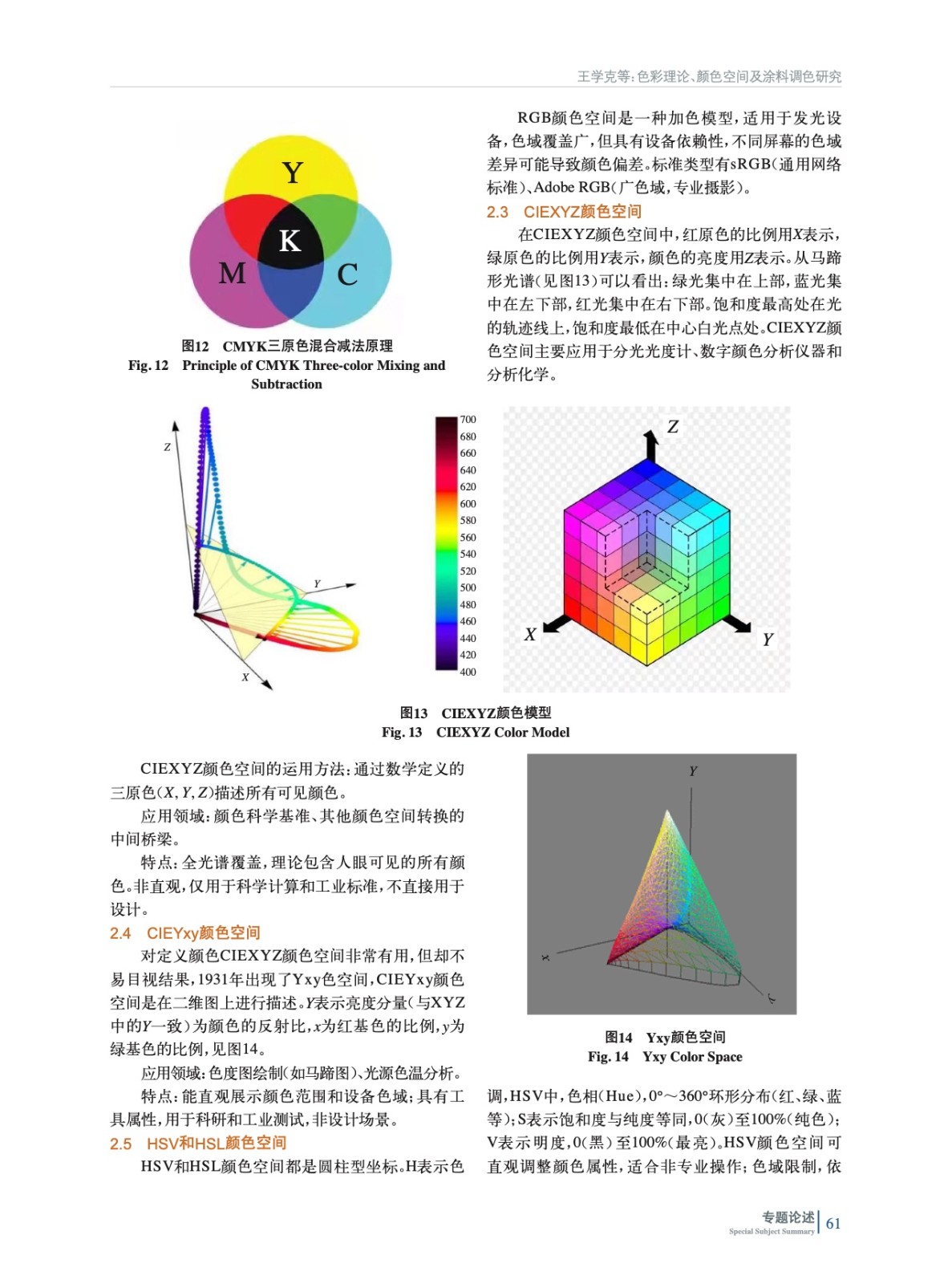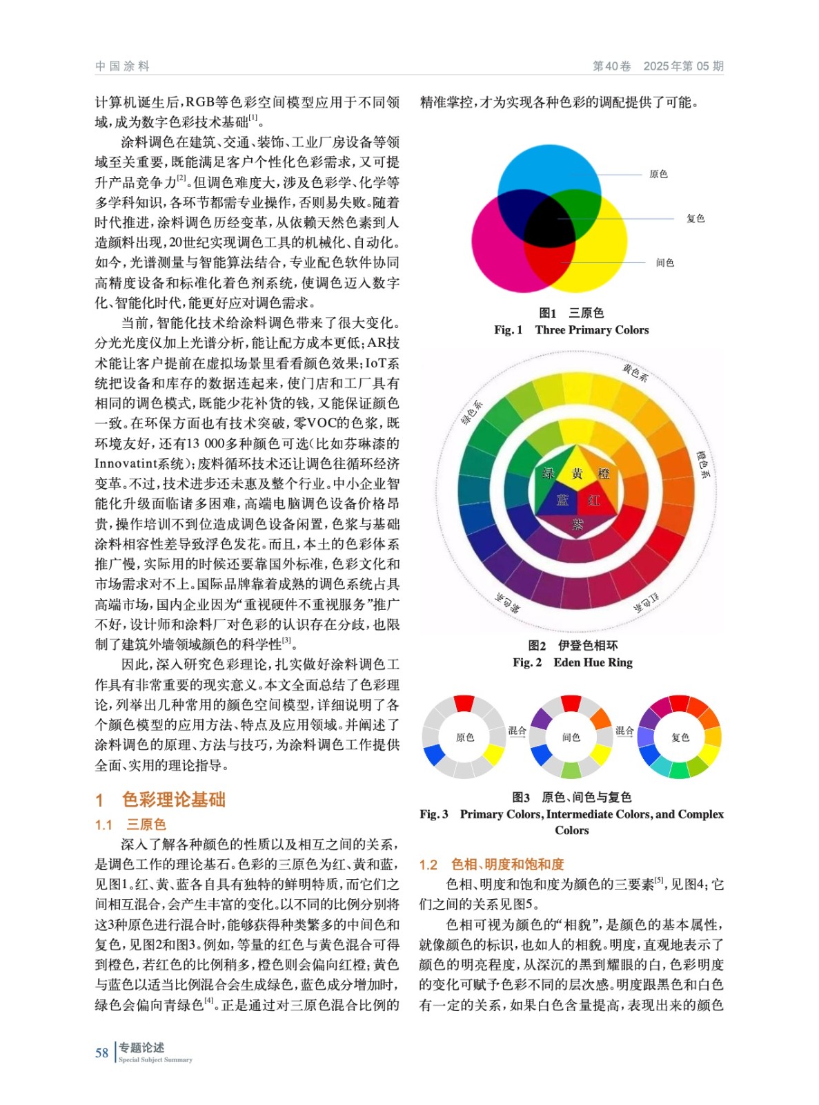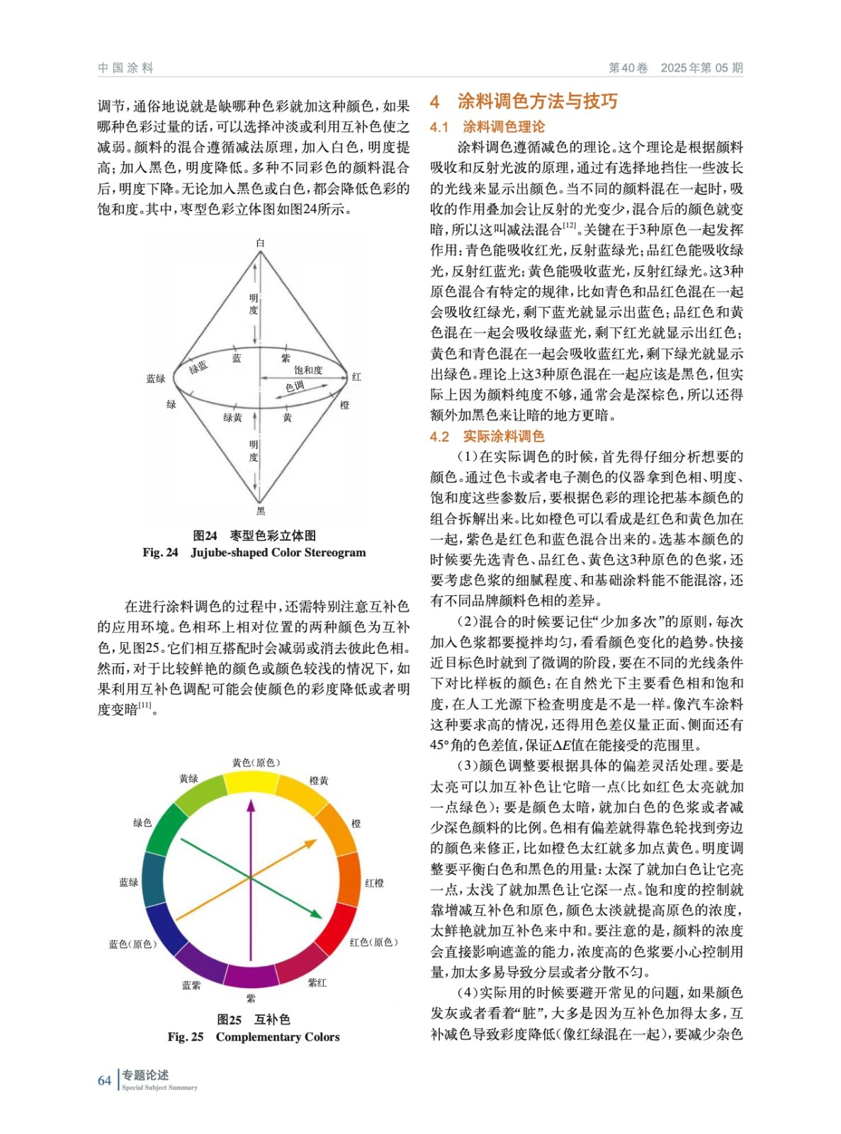 摘要:旨在深入探討涂料調色的原理與方法,全面總結了色彩理論,列舉出幾種常用的顏色空間模型,詳細說明了各個顏色模型的應用方法、特點及應用領域。并闡述了涂料調色遵循減法原理,多種不同彩色的顏料混合后,明度下降。調色的原理是通過改變彩色顏料之間的配比來調節色相;改變黑色和白色的配比調節明度;改變彩色顏料占總顏料的比例調節飽和度。調色的目標是最終實現顏色3個要素與樣板色一致。另外還闡述了涂料調色方法、技巧及影響因素,為涂料調色工作提供一定而實用的理論指導。