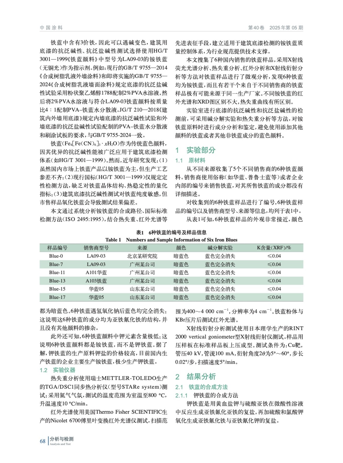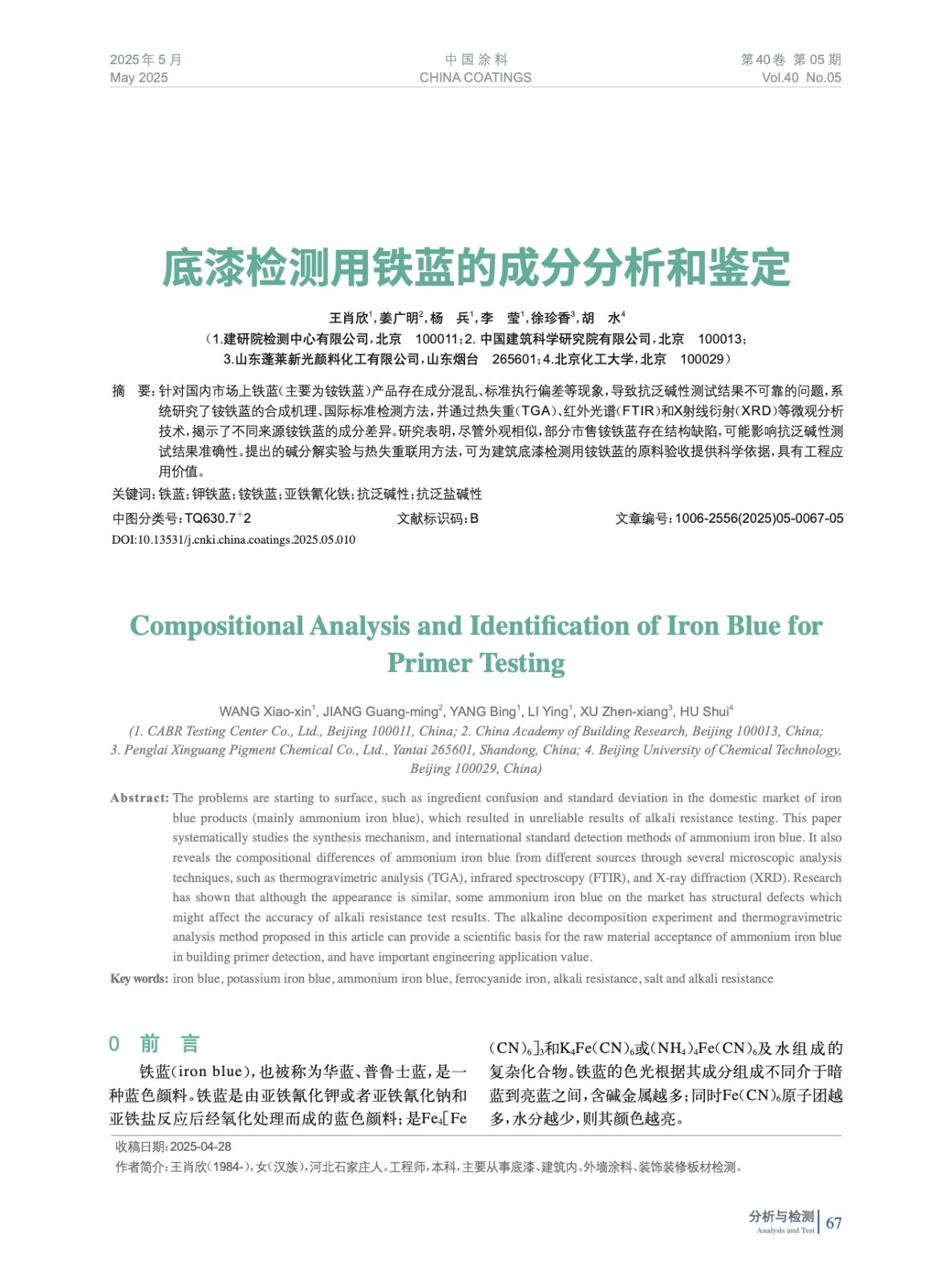 摘要:針對(duì)國內(nèi)市場(chǎng)上鐵藍(lán)(主要為銨鐵藍(lán))產(chǎn)品存在成分混亂、標(biāo)準(zhǔn)執(zhí)行偏差等現(xiàn)象,導(dǎo)致抗泛堿性測(cè)試結(jié)果不可靠的問題,系統(tǒng)研究了銨鐵藍(lán)的合成機(jī)理、國際標(biāo)準(zhǔn)檢測(cè)方法,并通過熱失重(TGA)、紅外光譜(FTIR)和X射線衍射(XRD)等微觀分析技術(shù),揭示了不同來源銨鐵藍(lán)的成分差異。研究表明,盡管外觀相似,部分市售銨鐵藍(lán)存在結(jié)構(gòu)缺陷,可能影響抗泛堿性測(cè)試結(jié)果準(zhǔn)確性。提出的堿分解實(shí)驗(yàn)與熱失重聯(lián)用方法,可為建筑底漆檢測(cè)用銨鐵藍(lán)的原料驗(yàn)收提供科學(xué)依據(jù),具有工程應(yīng)用價(jià)值。