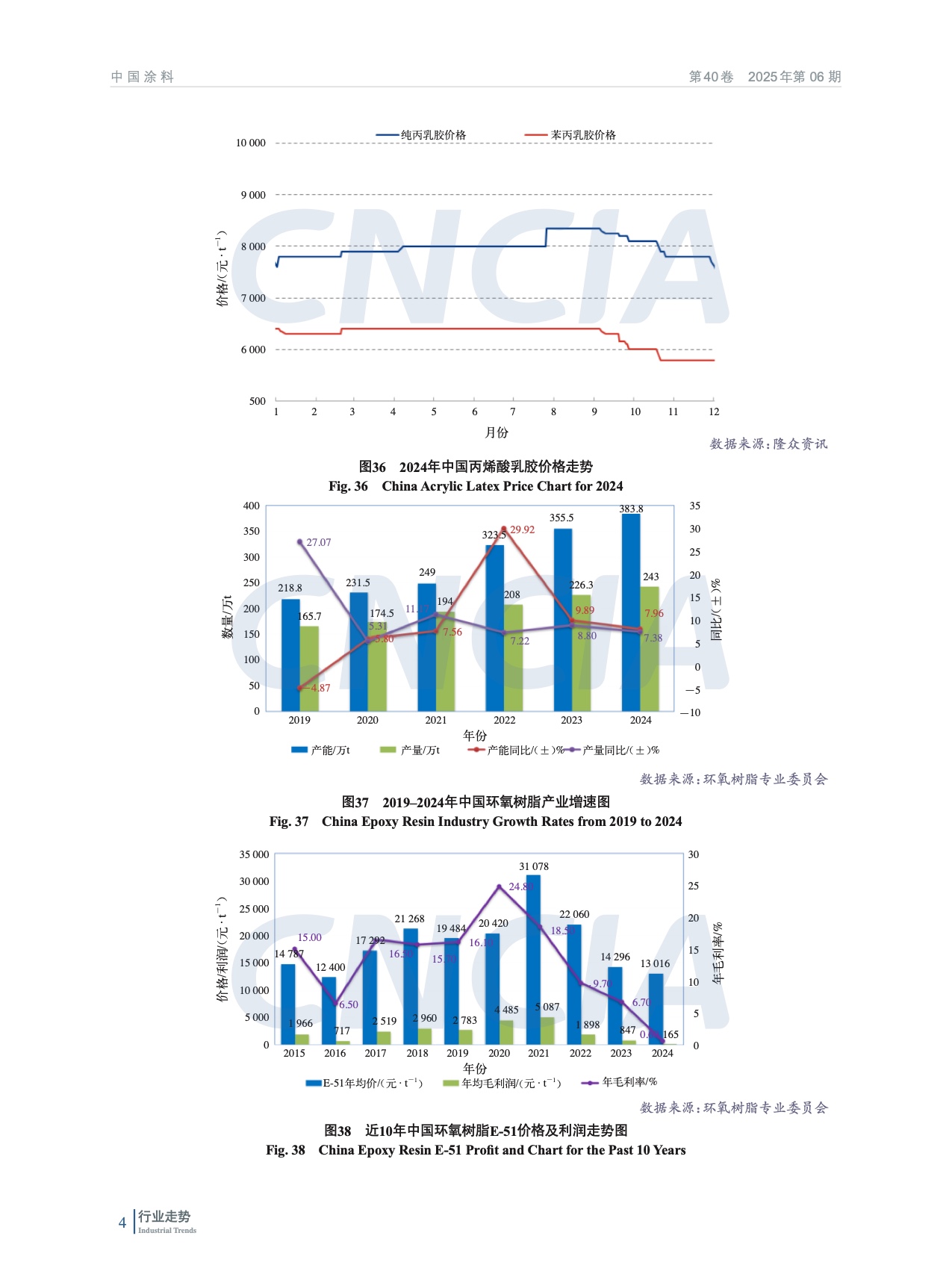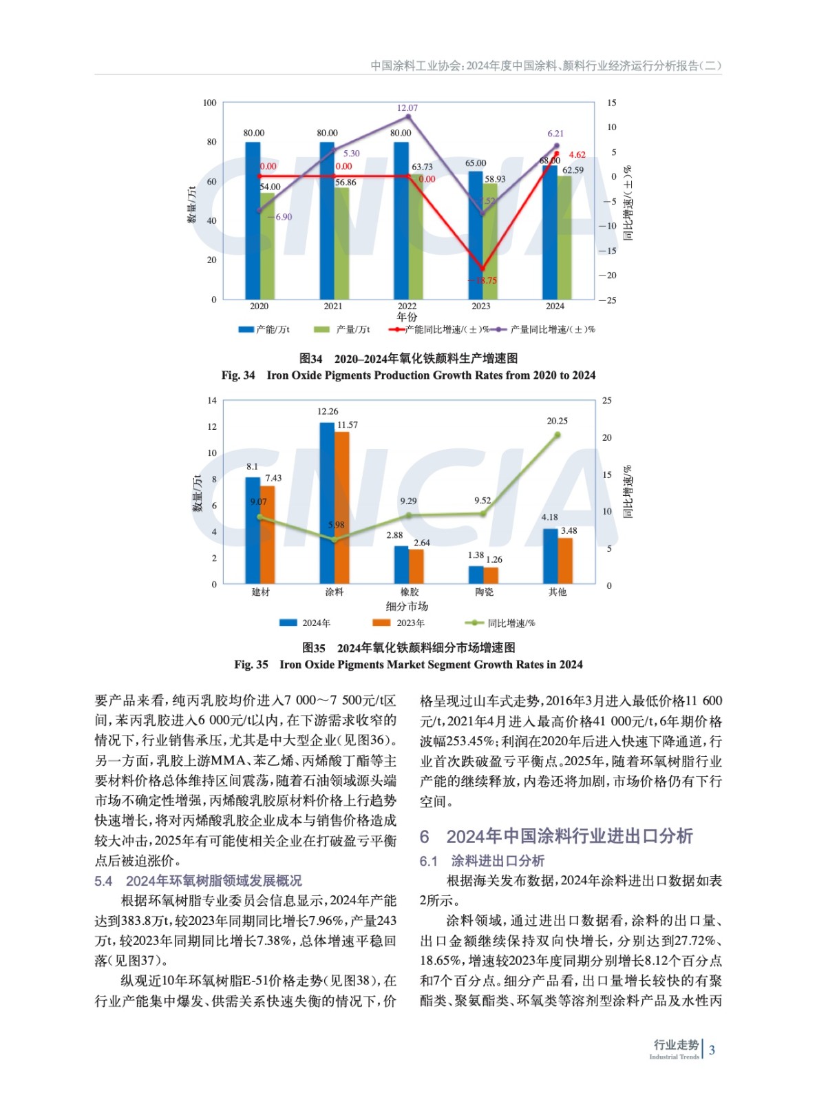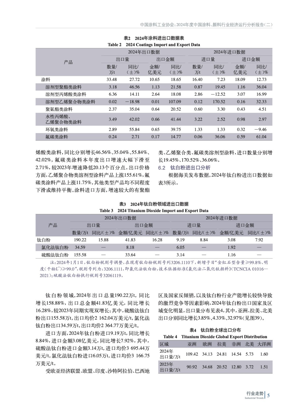 摘要:簡析了2024年中國宏觀經濟及外部環境發展情況,概括介紹了2024年房地產、機械、集裝箱、船舶、家具、新能源等涂料重點下游行業、新興領域發展概況及對涂料行業的影響,重點分析了2024年度中國涂料行業發展和進出口情況。綜述了全球涂料行業發展概況,對2024年全球涂料行業發展影響因素、全球涂料行業增長動力、全球涂料行業細分領域趨勢進行了分析。最后對涂料上游鈦白粉、氧化鐵、丙烯酸乳液和環氧樹脂等重點原材料領域發展情況進行了概述,并對中國涂料行業特征和發展趨勢進行了分析和預測。