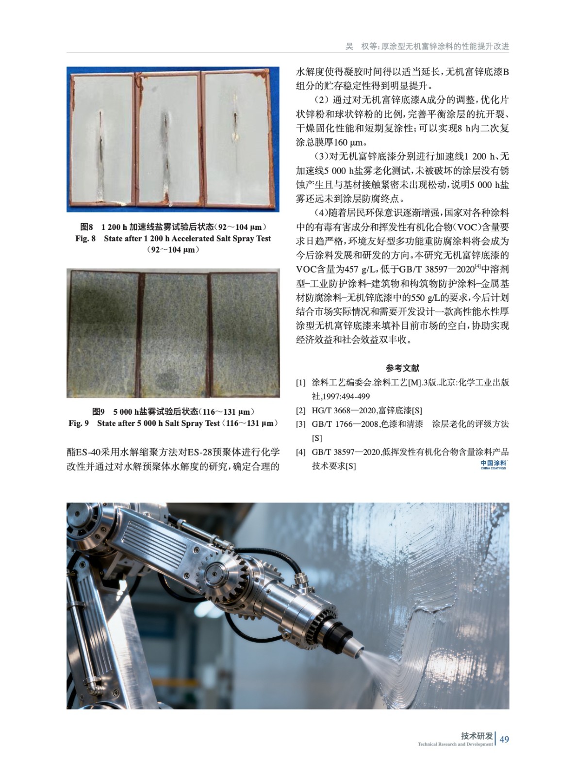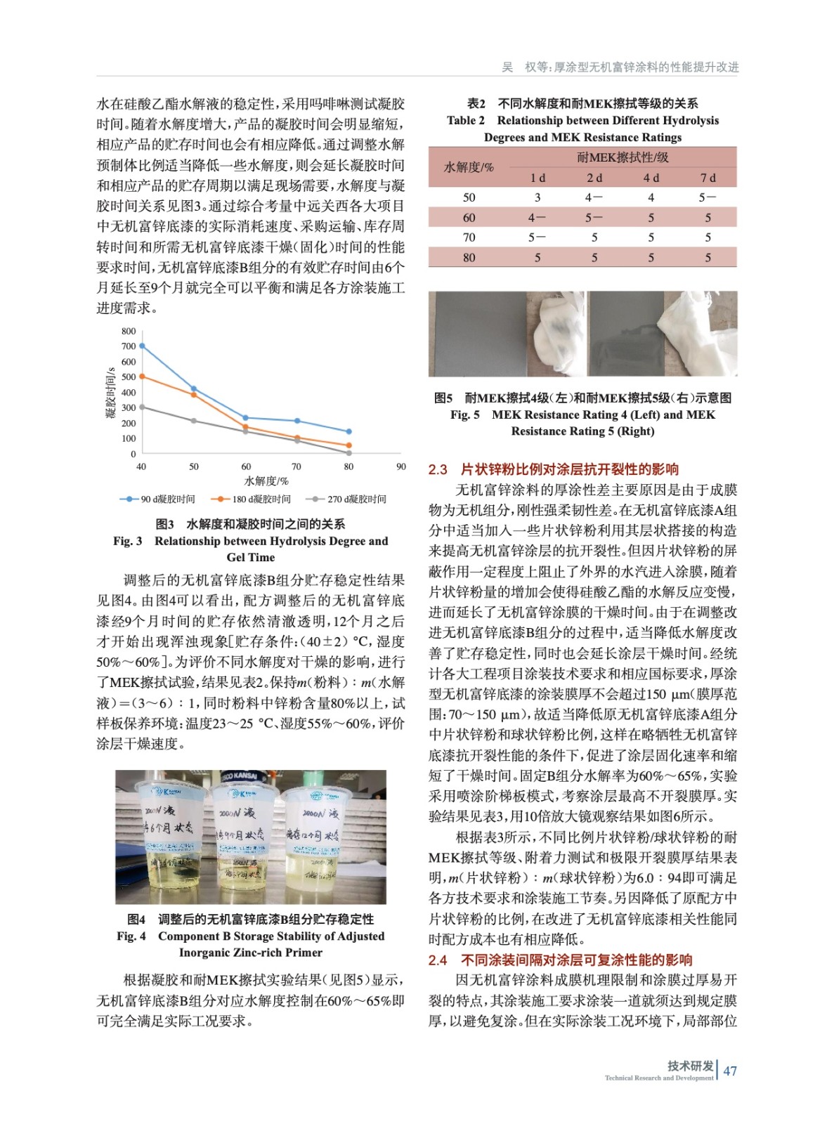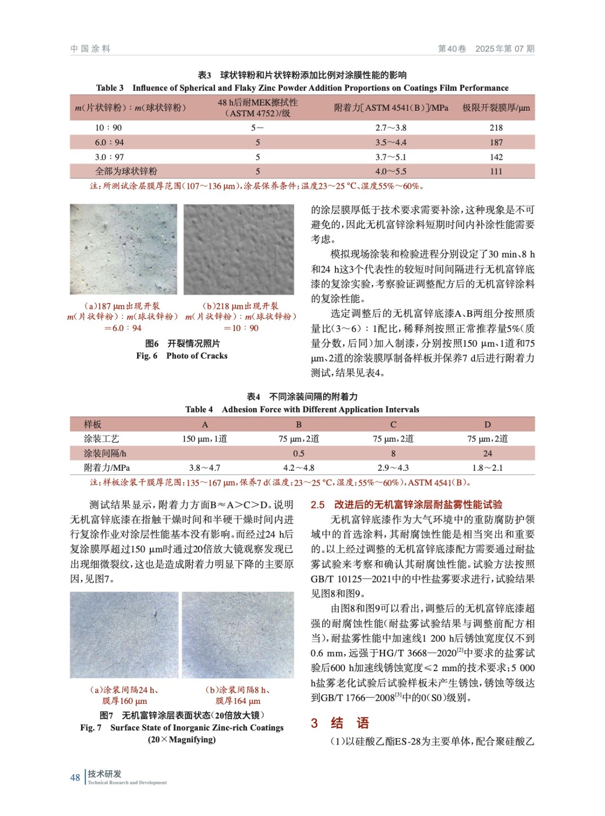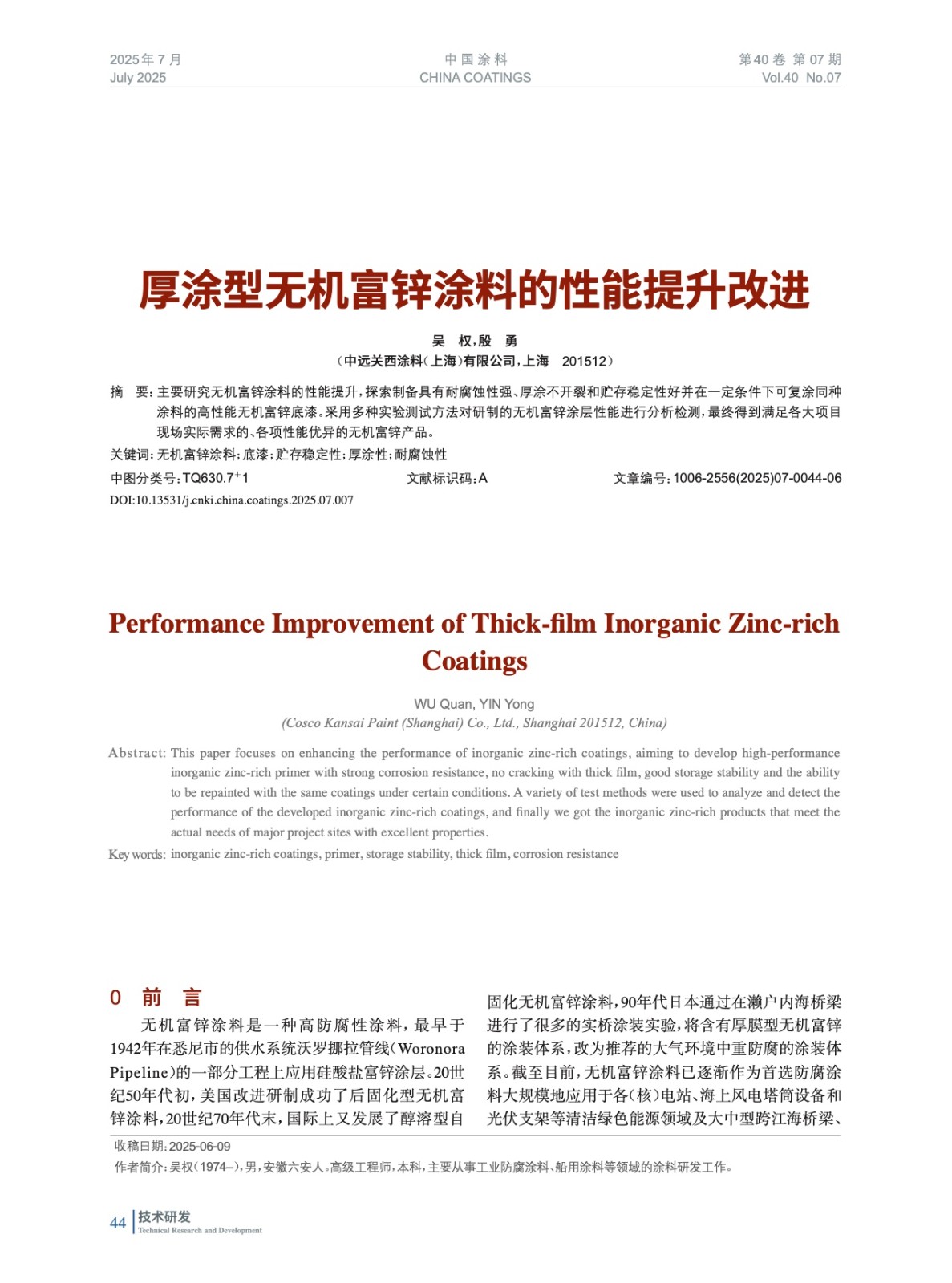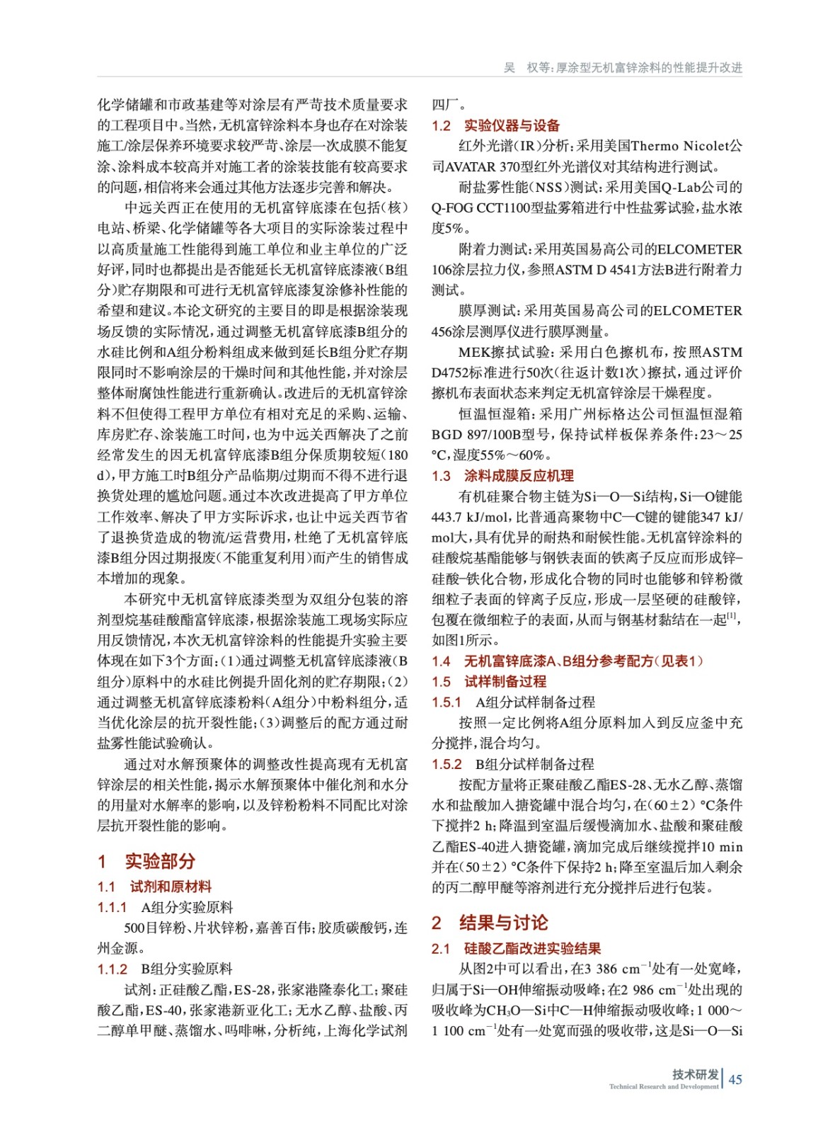 摘要:主要研究無機富鋅涂料的性能提升,探索制備具有耐腐蝕性強、厚涂不開裂和貯存穩(wěn)定性好并在一定條件下可復涂同種涂料的高性能無機富鋅底漆。采用多種實驗測試方法對研制的無機富鋅涂層性能進行分析檢測,最終得到滿足各大項目現(xiàn)場實際需求的、各項性能優(yōu)異的無機富鋅產(chǎn)品。