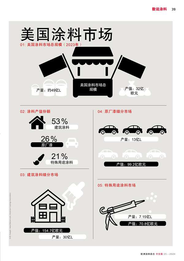 摘要:美國(guó)涂料市場(chǎng)總規(guī)模( 2023年)產(chǎn)量約49億L,產(chǎn)值 32億歐元