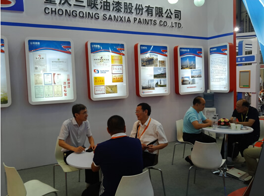 2015年中國國際涂料博覽會暨第十八屆中國國際涂料展覽會期間,渝三峽的展臺設計大氣清新,重點突出低碳環保理念。渝三峽通過展示歷史沿革、產品展示、產品優勢、業績展示等板塊充分展示了公司的發展變化和取得的輝煌成就。現場專業觀眾特別對渝三峽的水性工業漆產品表現出極大的興趣,不僅觀看樣品、索取資料,還與公司技術人員進行了深度交流,公司技術人員的專業講解得到了現場觀眾的認可和贊同。