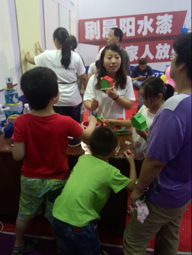晨陽水漆展區重點展示了公司生產的環保型家裝水漆和多功能水漆。為了讓參觀者更好地了解環保水漆特性和應用,公司展位精心設計了海報、宣傳單頁;布置有水漆應用在工業、家裝、木器領域的展板和模型;邀請參觀人員現場用水漆涂刷木房子,親身體驗晨陽水漆的環保特性,現場更有訂單抽獎100%中獎活動等給廣大老百姓帶來實惠的環節,成為了展會關注焦點,參觀者絡繹不絕。
