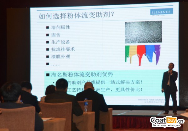 推介會上,海名斯技術二部經理林東升先生介紹了公司相關溶劑型產品,包括4080F、粉體流變助劑、超分散劑。技術主任張麗英女士重點分享了水性防腐&水性金屬烤漆案例、水性玻璃漆&水性木器案例。作為一個專業的助劑及樹脂生產商,海名斯以其優異的產品性能與環保技術,致力于推動中國涂料行業的環保進步,在中國市場推出了系列化的水性體系用助劑產品。