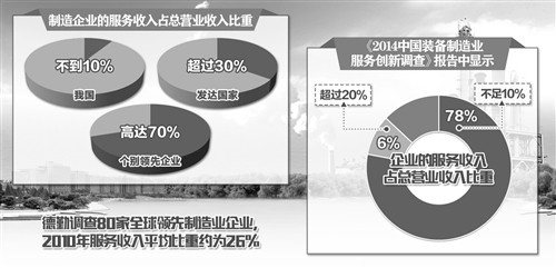 其中,有一個對企業(yè)服務(wù)型制造發(fā)展的量化指標(biāo),即示范企業(yè)服務(wù)收入占銷售收入的比重達到30%左右。對此,工信部產(chǎn)業(yè)政策司相關(guān)負(fù)責(zé)人解釋說,按照中國機械工業(yè)聯(lián)合會與德勤聯(lián)合發(fā)布的《2014中國裝備制造業(yè)服務(wù)創(chuàng)新調(diào)查》報告顯示,78%調(diào)查企業(yè)的服務(wù)收入占總營業(yè)收入比重不足10%,只有6%的調(diào)查企業(yè)占比超過20%。德勤調(diào)查了80家全球領(lǐng)先制造業(yè)企業(yè),2010年服務(wù)收入平均比重約為26%。綜合相關(guān)調(diào)研成果,《行動指南》把示范企業(yè)服務(wù)收入占比設(shè)定在30%左右是完全可行的,也充分體現(xiàn)了發(fā)展的趨勢和要求。