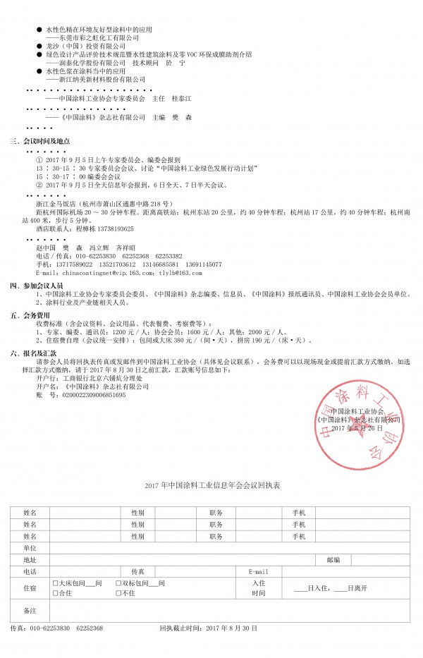 請(qǐng)參會(huì)人員將回執(zhí)表傳真或發(fā)郵件到中國(guó)涂料工業(yè)協(xié)會(huì)(具體見會(huì)議聯(lián)系),會(huì)務(wù)費(fèi)可以以現(xiàn)場(chǎng)現(xiàn)金或提前匯款方式繳納。如選擇匯款方式繳納,請(qǐng)于2017年8月30日之前匯款,匯款賬號(hào)信息如下: