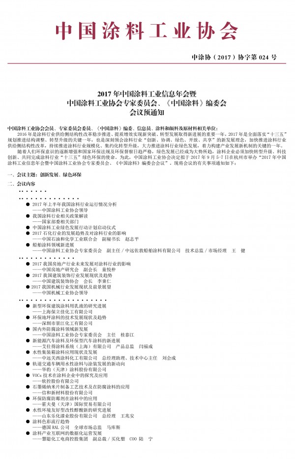 隨著人們環(huán)保意識(shí)的逐漸增強(qiáng)和國(guó)家環(huán)保法規(guī)及環(huán)保督察日趨嚴(yán)格,綠色發(fā)展已經(jīng)成為大勢(shì)所趨,涂料企業(yè)必須加快轉(zhuǎn)型升級(jí)、科技創(chuàng)新、共同完成涂料行業(yè)“十三五”綠色環(huán)保的使命。為此,中國(guó)涂料工業(yè)協(xié)會(huì)決定擬于2017年9月5-7日在杭州市舉辦“2017年中國(guó)涂料工業(yè)信息年會(huì)暨中國(guó)涂料工業(yè)協(xié)會(huì)專家委員會(huì)、《中國(guó)涂料》編委會(huì)會(huì)議”,屆時(shí)召開中國(guó)涂料工業(yè)協(xié)會(huì)水性工業(yè)涂料涂裝分會(huì)籌備會(huì)。現(xiàn)將會(huì)議的有關(guān)事項(xiàng)通知如下: