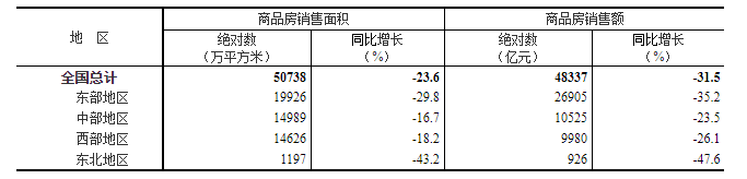 1—5月份,商品房銷售面積50738萬平方米,同比下降23.6%;其中,住宅銷售面積下降28.1%。商品房銷售額48337億元,下降31.5%;其中,住宅銷售額下降34.5%。