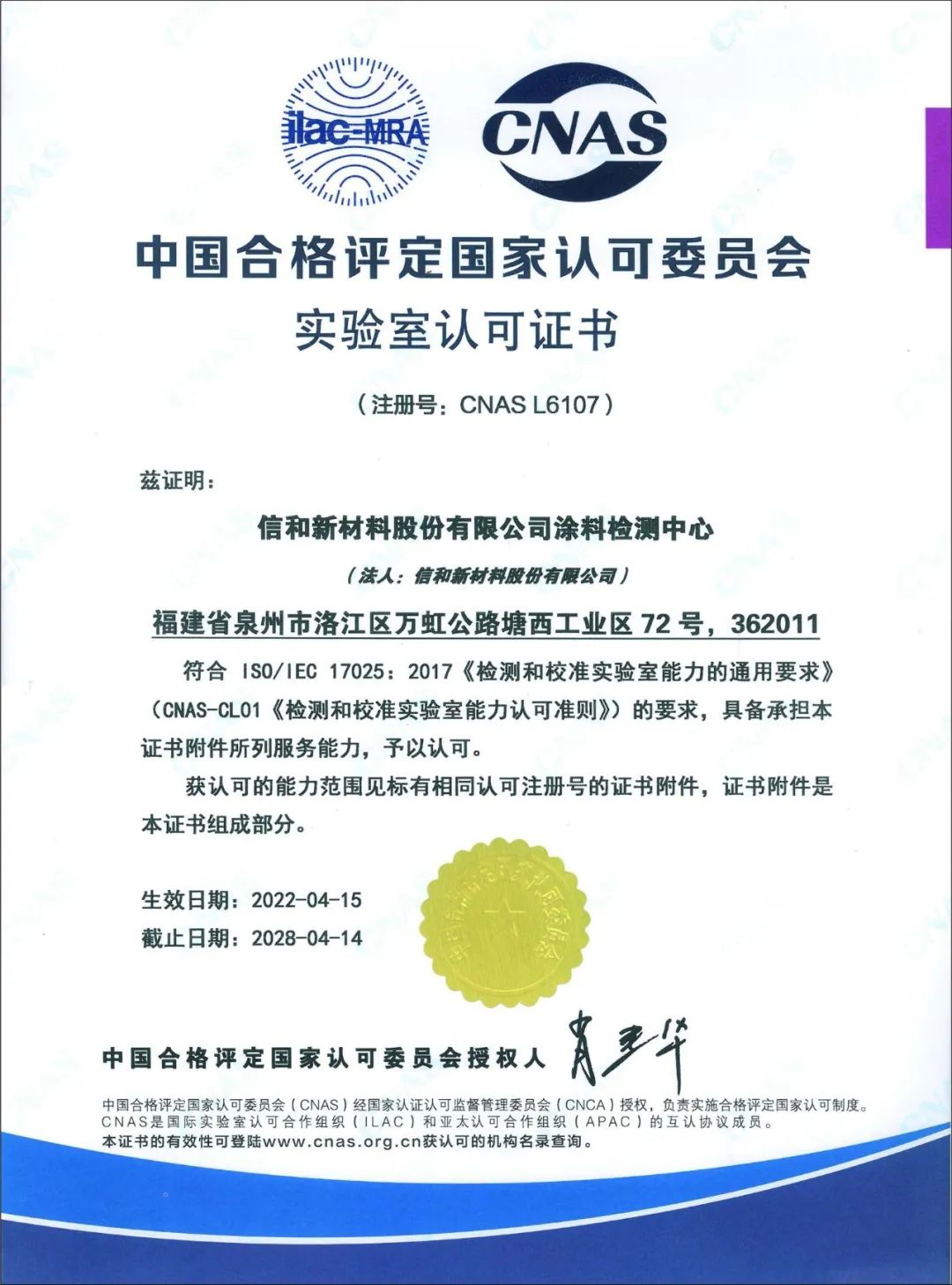 日前,信和新材料股份有限公司涂料檢測中心再獲國家級權威認證,榮獲CNAS實驗室認可。