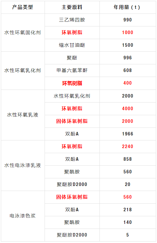 該項目中,環氧樹脂主要應用于水性環氧乳液和水性電泳漆當中,根據原料消耗統計,液體/固體環氧樹脂消耗量為10200噸/年,此外雙酚A消耗量為3042噸/年,酸酐和胺類固化劑也有一定的使用量。
