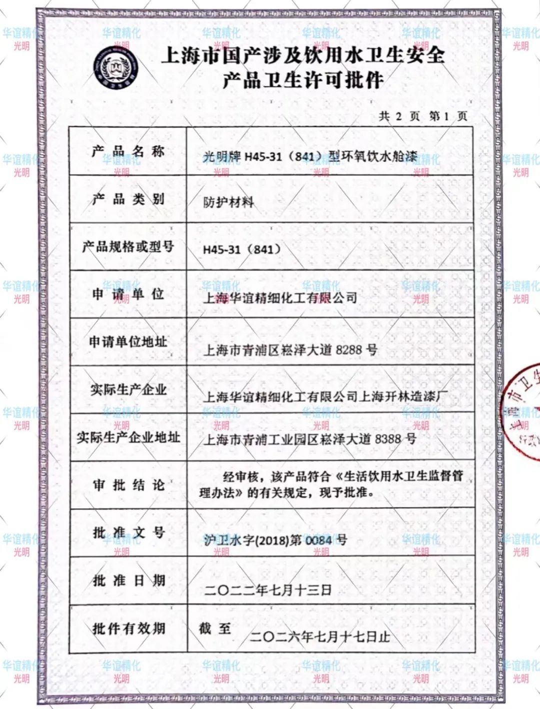 開林廠是老牌生產(chǎn)船舶涂料的企業(yè),其中H45-31(841)產(chǎn)品主要應(yīng)用于船舶飲水艙、蒸餾水艙、水箱、輸水管道等各類涉水容器內(nèi)壁,因涉及飲用水安全,作為產(chǎn)品生產(chǎn)企業(yè),開林秉著對社會負(fù)責(zé)、對客戶負(fù)責(zé)、對自己負(fù)責(zé)的企業(yè)精神,把保障產(chǎn)品安全的生產(chǎn)理念放在首位。早在2003年就取得涉水產(chǎn)品衛(wèi)生許可批件證書,這一證書是H45-31(841)產(chǎn)品是否符合飲用水衛(wèi)生安全要求最為重要的標(biāo)準(zhǔn)之一,也是進(jìn)入涉及飲用水產(chǎn)品市場的“準(zhǔn)入證”,更是確保涉水產(chǎn)品衛(wèi)生安全、產(chǎn)品質(zhì)量的必要措施。