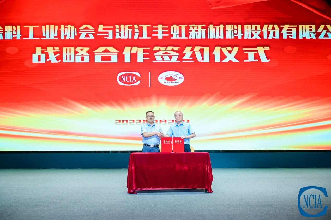 為支持國家政策創新發展,綜合展示企業實力與水平,協助企業提升品牌的知名度與影響力,中國涂料工業協會和浙江豐虹新材料股份有限公司雙方經過充分協商,達成合作意向,并于2022年8月25日,2022年中國涂料工業信息年會同期,舉行盛大戰略合作簽約儀式。中國涂料工業協會副秘書長趙中國與浙江豐虹新材料股份有限公司總裁兼總工王春偉作為雙方代表共同簽署戰略合作協議。