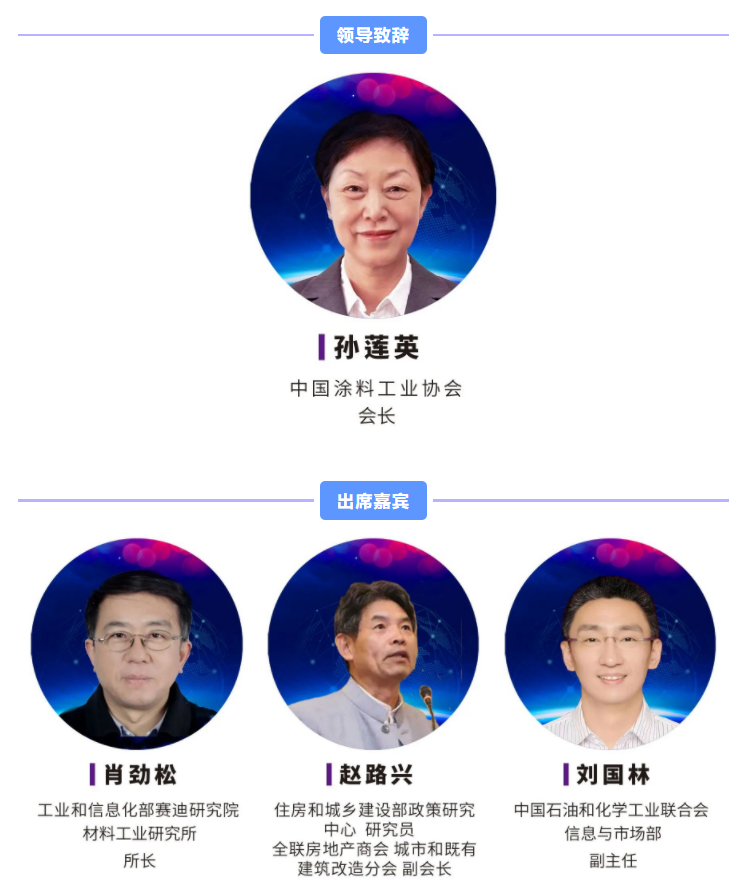中國涂料工業(yè)協(xié)會孫蓮英會長、工業(yè)和信息化部賽迪研究院材料工業(yè)研究所所長肖勁松、住房和城鄉(xiāng)建設部政策研究中心研究院&全聯(lián)房地產(chǎn)商會城市和既有建筑改造分會副會長趙興路、中國石油和化學工業(yè)聯(lián)合會信息與市場部副主任劉國林等嘉賓將出席會議,為會議致辭或發(fā)表主題演講。