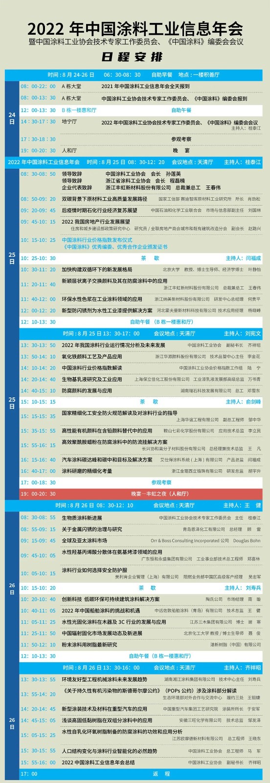 8月24–26日,“2022年中國涂料工業(yè)信息年會暨中國涂料工業(yè)協(xié)會技術專家工作委員會、《中國涂料》編委會會議”將在浙江安吉盛大開幕,來自政府部門、涂料企業(yè)、原材料企業(yè)、設備企業(yè)、互聯(lián)網(wǎng)公司及行業(yè)專家的約500余位代表將出席會議。