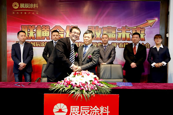 新年伊始、萬(wàn)象更新。2015年2月2日下午,上海展辰涂料有限公司與三大合營(yíng)公司正式舉行簽約儀式。董事長(zhǎng)陳冰,輪值總裁劉順、輪值總裁孫金平等領(lǐng)導(dǎo)攜集團(tuán)中心各部門負(fù)責(zé)人及上海展辰業(yè)務(wù)一部全體經(jīng)銷商齊聚一堂,共襄盛舉。