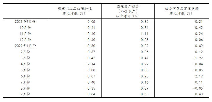 (2)根據(jù)季節(jié)調(diào)整模型自動修正結(jié)果,對近一年來各期國內(nèi)生產(chǎn)總值、規(guī)模以上工業(yè)增加值、固定資產(chǎn)投資(不含農(nóng)戶)、社會消費品零售總額環(huán)比增速進行修訂。修訂結(jié)果及2022年三季度GDP環(huán)比數(shù)據(jù)、2022年9月份其他指標環(huán)比數(shù)據(jù)如下: