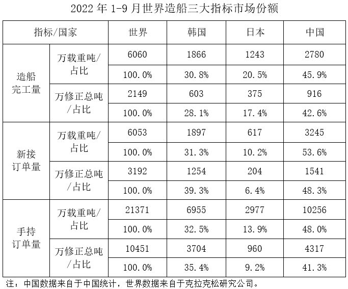 按修正總噸計,中國造船完工量、新接訂單量、手持訂單量分別占世界市場份額的42.6%、48.3%和41.3%。