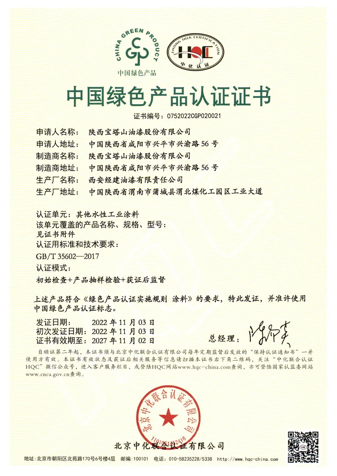 北京中化聯會認證有限公司(HQC)資深專家根據國家標準GB/T35602-2017《綠色產品評價 涂料》和CNCA-CGP-02:2021《綠色產品認證實施規則 涂料》的要求,對寶塔山漆水性地坪涂料、室內用常溫自干型水性防腐涂料、其他水性工業涂料3個單元11款產品,從資源、能源、環境、品質4大指標進行評審,并順利通過審核,獲得中國綠色產品認證。