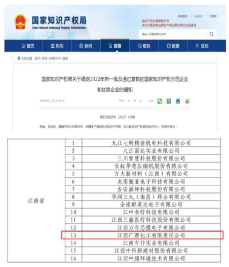 近日,國家知識產權局發布《關于確定2022年新一批國家知識產權優勢企業的通知》,江西廣源化工有限責任公司成功上榜“國家知識產權優勢企業”,這標志著公司在知識產權工作邁上更高的臺階。