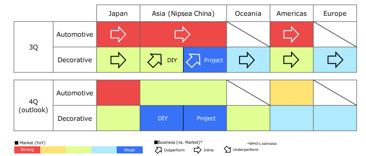 第三季度,全球汽車制造業(yè)市場表現(xiàn)出顯著的反彈,使得立邦汽車涂料業(yè)務(wù)在日本、中國、東南亞和美洲的地區(qū)保持了穩(wěn)定的增長勢頭。第四季度受季節(jié)性原因,中國、東南亞的汽車市場可能會放緩節(jié)奏,但美洲和日本依舊市場看好。