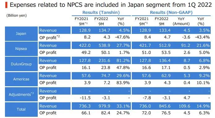 前三季度立邦在日本地區(qū)的營收同比增長4.5%至1347.15億日元(約合68億元人民幣)。受原材料價格上漲等因素影響,營業(yè)利潤同比下降47.6%至43.11億日元(約合2億元人民幣)。從第一季度開始,除與上市公司功能相關(guān)的業(yè)務(wù)和費用此前計入“調(diào)整”的純控股公司以外的所有業(yè)務(wù)均被剝離,移至日本部門,這一調(diào)整的目的,是為了更恰當(dāng)?shù)胤从掣鲬?yīng)報告部門的經(jīng)營業(yè)績。