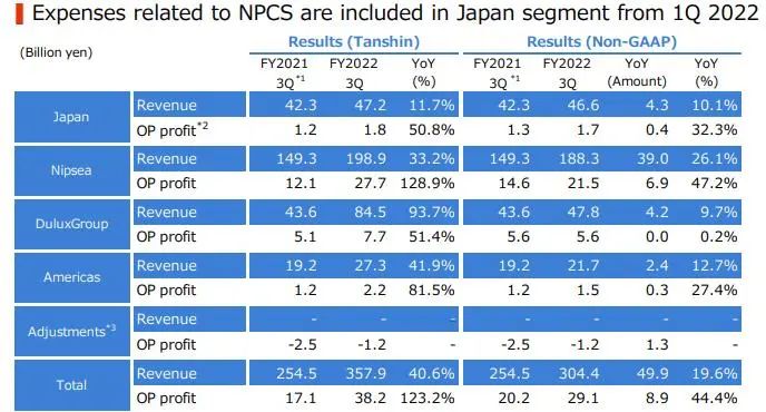 立邦在報告中指出,前三季度業(yè)績上漲主要得益于其于2022年1月20日收購歐洲涂料制造商Cromology和于2022年5月31日收購歐洲涂料制造商JUB為子公司,以及日元貶值,再加上立邦中國裝飾涂料業(yè)務(wù)銷售價格持續(xù)上漲的推動。