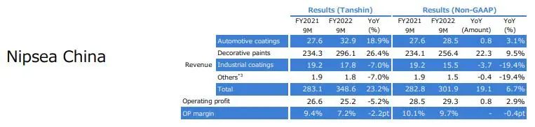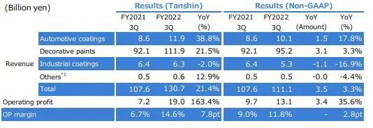 前三季度由于半導(dǎo)體芯片短缺和其他因素導(dǎo)致汽車生產(chǎn)數(shù)量下降,導(dǎo)致日本本土的汽車涂料銷售收入下降。受新建住宅開工穩(wěn)定和其他有利市場條件的推動,工業(yè)涂料收入增加。由于市場條件的改善,裝飾涂料收入也有所增加。