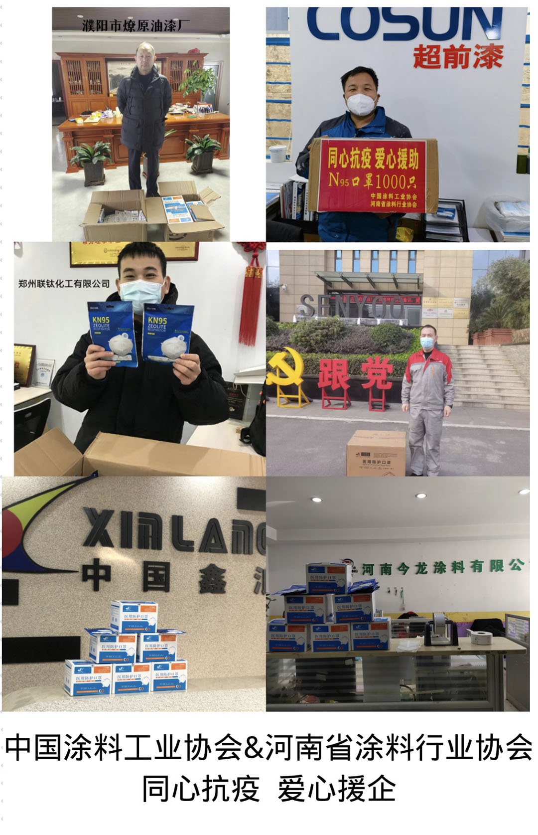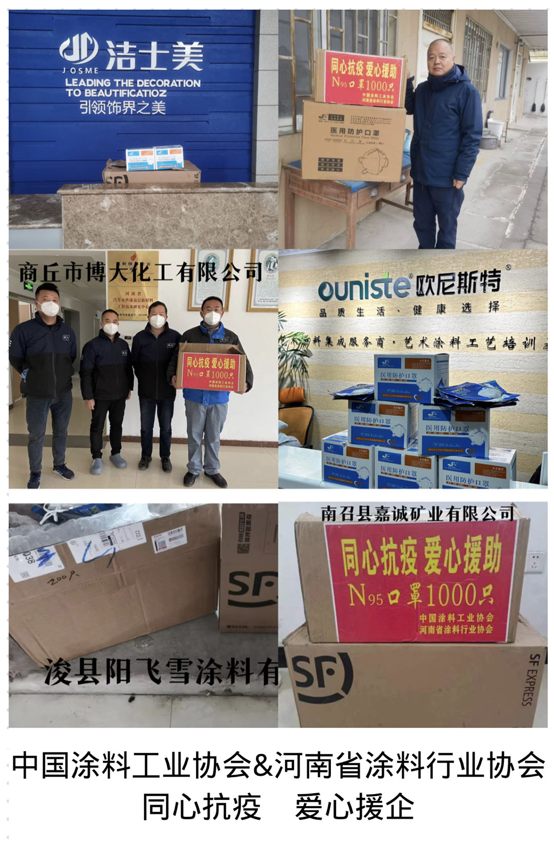 為感謝中國涂料工業協會對河南省涂料行業疫情防控工作的關心、關愛,落實河南省涂料行業協會謝偉會長“一定要把中國涂料工業協會和孫蓮英會長的關懷送到相關企業”的指示精神,河南省涂料行業協會購置10000只N95口罩與中國涂料工業協會援助的“愛心口罩”一道,分別配送到了疫情防控形勢嚴峻的有關會員企業。由于河南部分地區疫情形勢依然嚴峻,個別企業因物流受限還未收到,多數企業收到并已回復。