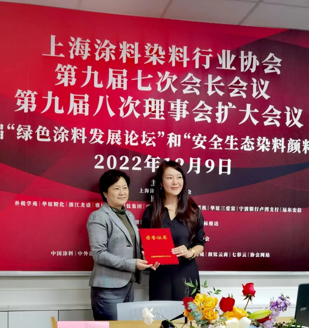 上海華誼精細化工有限公司黨委副書記總經理楊紅妹向新任副會長圣敏賢頒發(fā)證書