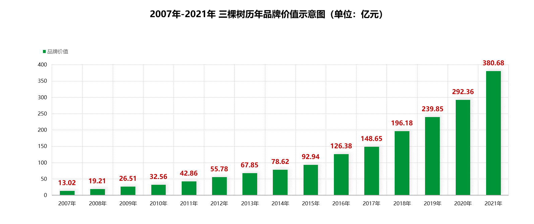 2007-2021年三棵樹歷年品牌價(jià)值示意圖 單位:億元