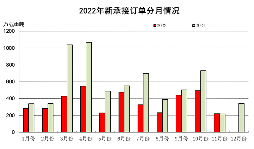 1~11月,50家重點(diǎn)監(jiān)測造船企業(yè)造船完工3203萬載重噸,同比下降8.9%。承接新船訂單3720萬載重噸,同比下降40.2%。11月底,手持船舶訂單10054萬載重噸,同比增長6.1%。