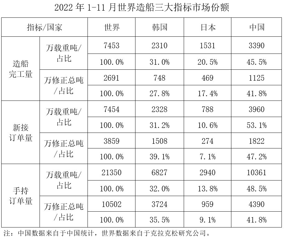 1~11月,我國造船完工量、新接訂單量、手持訂單量分別占世界市場份額的45.5%、53.1%和48.5%。