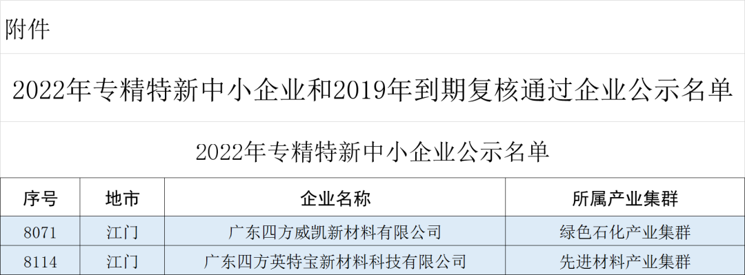 1月6日,廣東省工業(yè)和信息化廳公示了2022年專精特新中小企業(yè)名單。廣東四方威凱科技集團旗下廣東四方威凱新材料有限公司、廣東四方英特寶新材料科技有限公司雙雙入選,通過2022年廣東省“專精特新”中小企業(yè)認定。