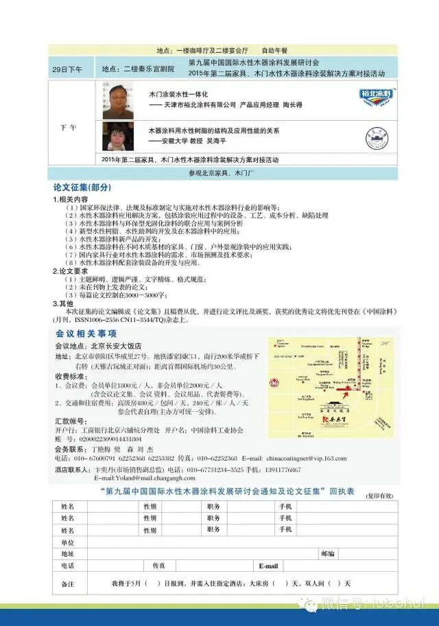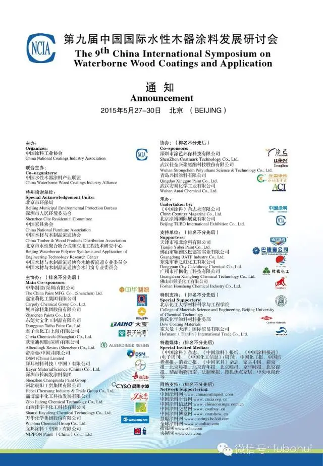 打造美麗中國從水性環保開始,中國涂料工業協會第九屆中國國際水性木器涂料發展研討會通知及議程將于2015年5月27-30日在北京長安國大飯店召開