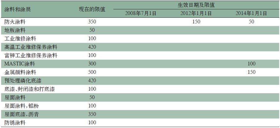 南海岸空氣質量管理區規定1113是從2003年1月1日起,分5年分階段實施的,其中一些產品的最后期限是2008年7月1日。{BiMis:page} SCAQMD Rule 1113的最新版本是2011年6月3日的修訂版,接上一版本的2008年7月1日,分2012年1月1日和2014年1月1日兩個階段。部分涂料和涂層的VOC限值見表3。