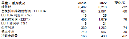綜合上述因素,本期息稅前利潤(EBIT)初步預計下降76%,減至約4.05億歐元(2022年:16.8億歐元),折舊和攤銷額約為4.18億歐元,較上年(4.02億歐元)略有增加。2023年全年利潤約3.30億歐元(2022年:12.8億歐元)。