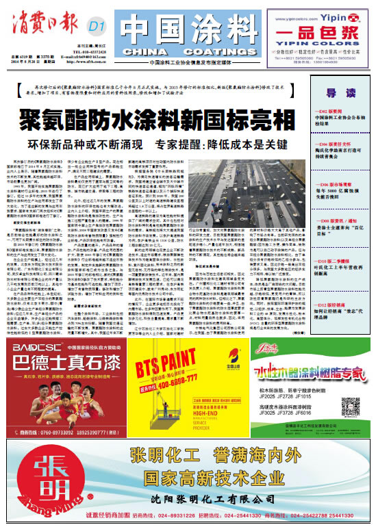 《中國涂料報》(電子版)的一切內容(包括但不限于文字、圖片、PDF、圖表、標志、標識、商標、版面設計、專欄目錄與名稱、內容分類標準以及為讀者提供的任何信息)僅供中國涂料信息網讀者閱讀、學習研究使用,未經中國涂料雜志社有限公司及/或相關權利人書面授權,任何單位及個人不得將《中國涂料報》(電子版)所登載、發布的內容用于商業性目的,包括但不限于轉載、復制、發行、制作光盤、數據庫、觸摸展示等行為方式,或將之在非本站所屬的服務器上作鏡像。否則,中國涂料雜志社有限公司將采取包括但不限于網上公示、向有關部門舉報、訴訟等一切合法手段,追究侵權者的法律責任。