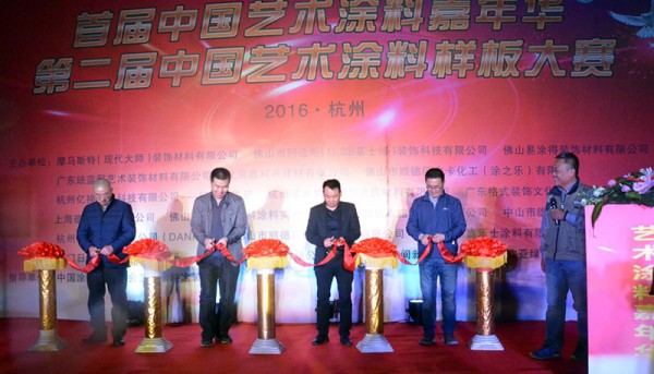 隨著中國涂料工業協會副秘書長劉杰、中國涂料工業協會藝術涂料涂裝分會理事長陶文生、秘書長梁海生、杭州裝飾裝修商會涂料委會長樓紅龍手中的紅綢飄然落下,標志著首屆中國藝術涂料嘉年華暨第二屆中國藝術涂料樣板大賽于2016年12月17日在杭州拉開帷幕。浙江省涂料工業協會秘書長馬新華、廣東省涂料行業協會秘書長呂水列應邀出席了活動啟動儀式。來自藝術涂料企業代表、涂裝工程師、下游經銷商、代理商等共計將近1 300人參加了此次活動。
